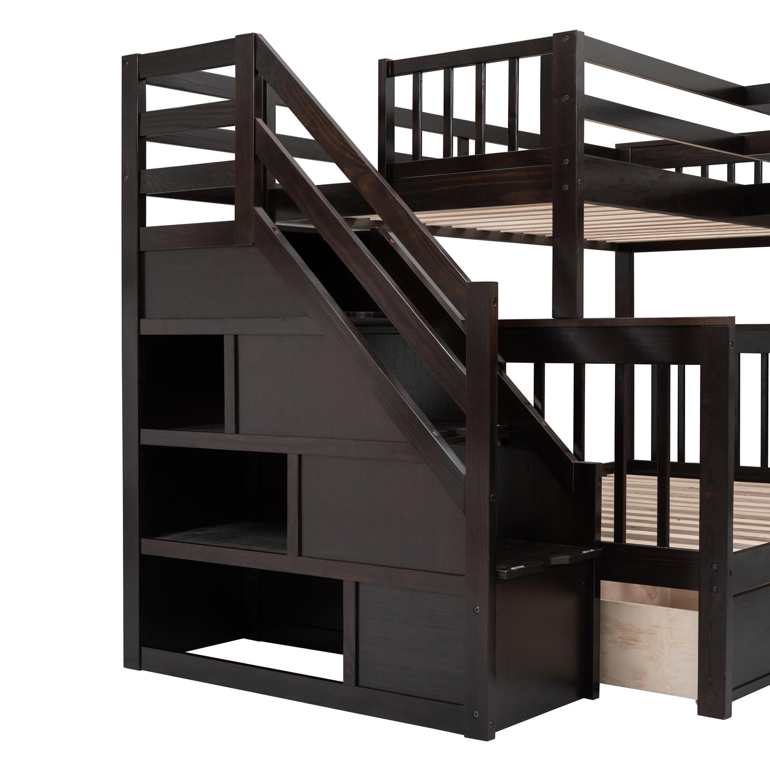 L-Shaped Bunk Bed for 4 Kids, Twin-Twin Over Full with 3 Drawers, Portable Desk and Wardrobe, Solid Wood Bedframe with Stairs and Full-Length Guardrails, No Box Spring Needed (Espresso)