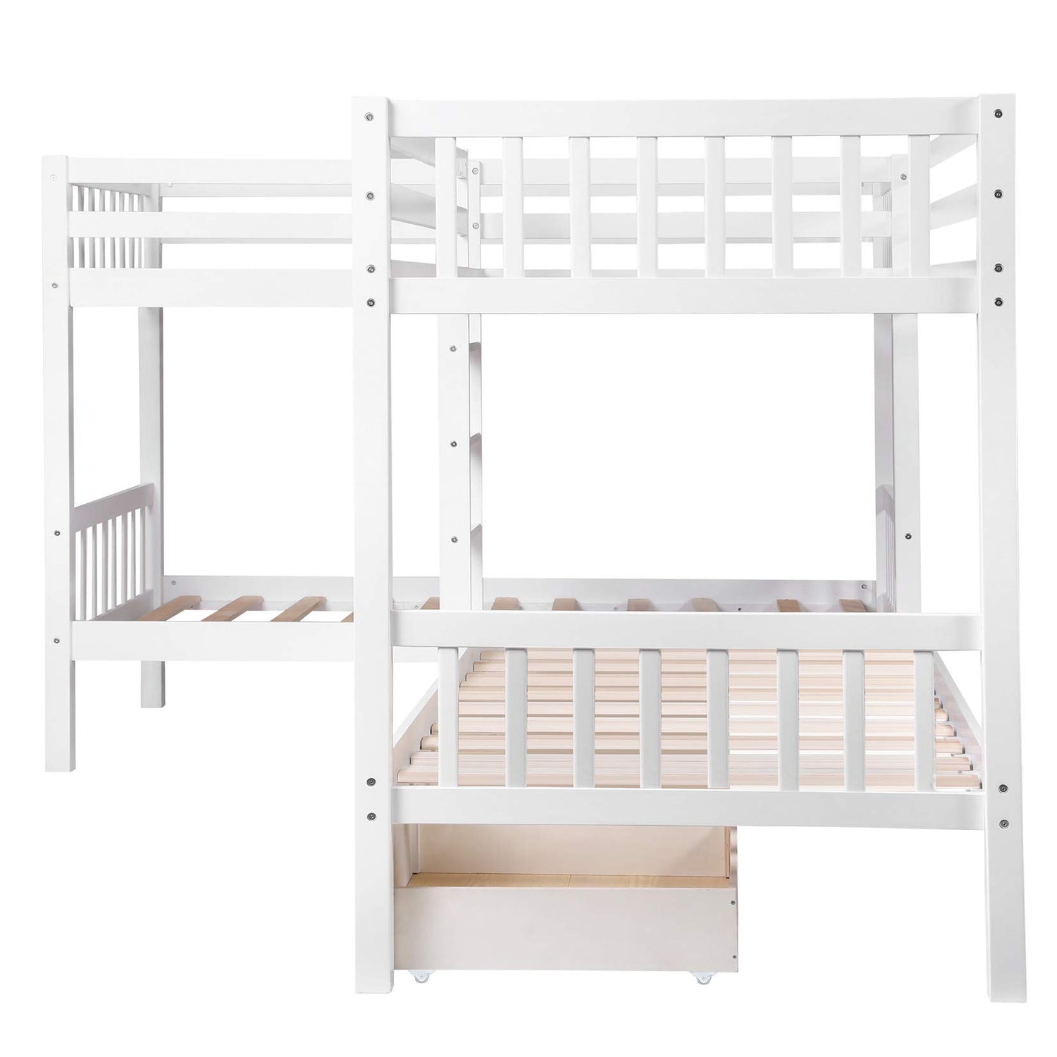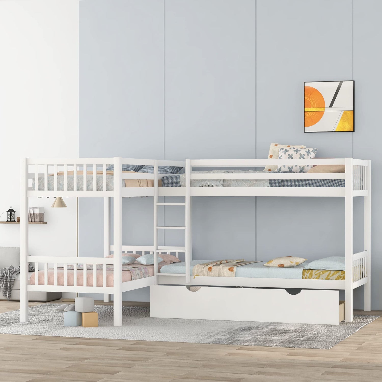 L-Shaped Bunk Bed with Drawers, Bunk Bed for 4 Twin Over Twin for Kids/Teen Wood Quad Bunk Beds Frame, White