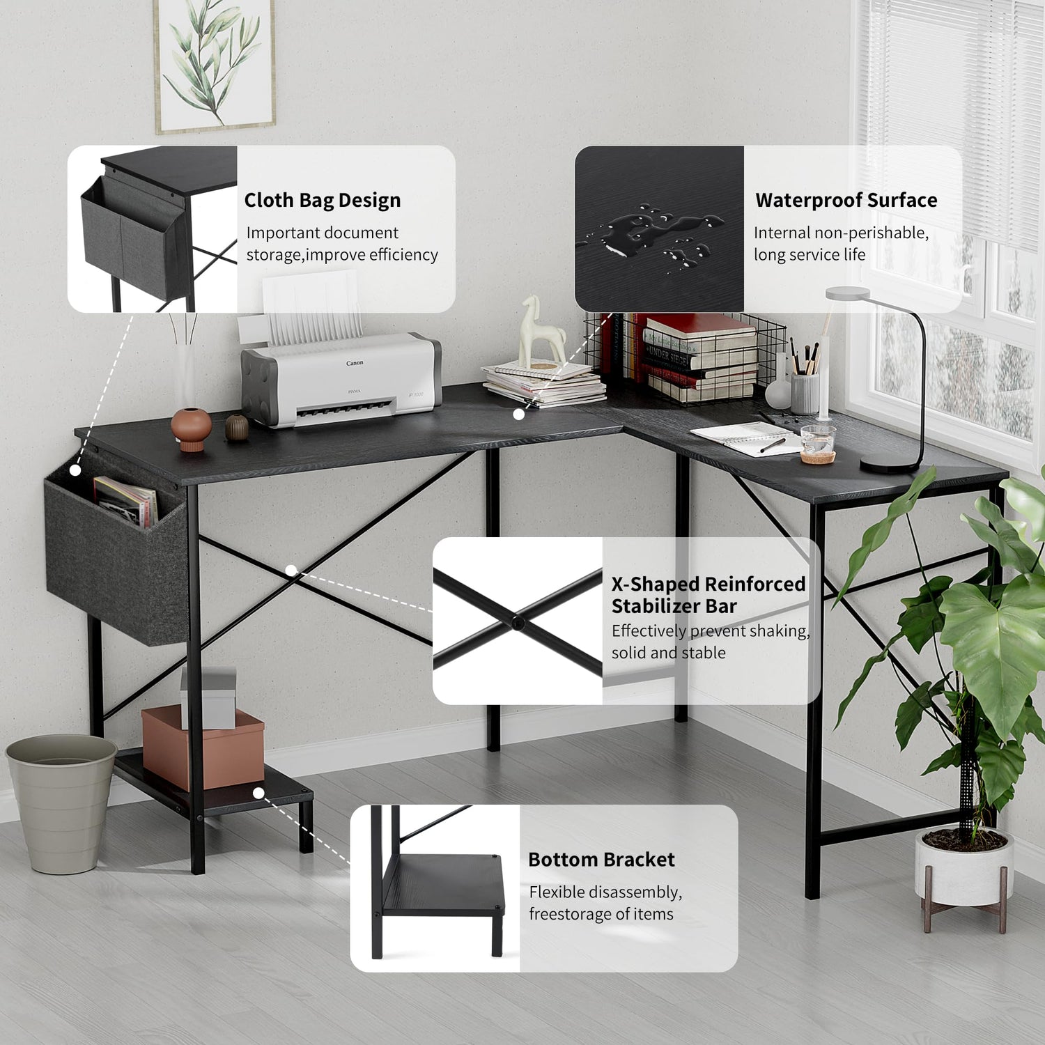 L Shaped Desk Gaming Computer 50 Inch Reversible Corner Table, PC Work Table for Writing Study Student with Wood Tabletop Metal Frame CPU Stand Side Bag for Home Office Small Place