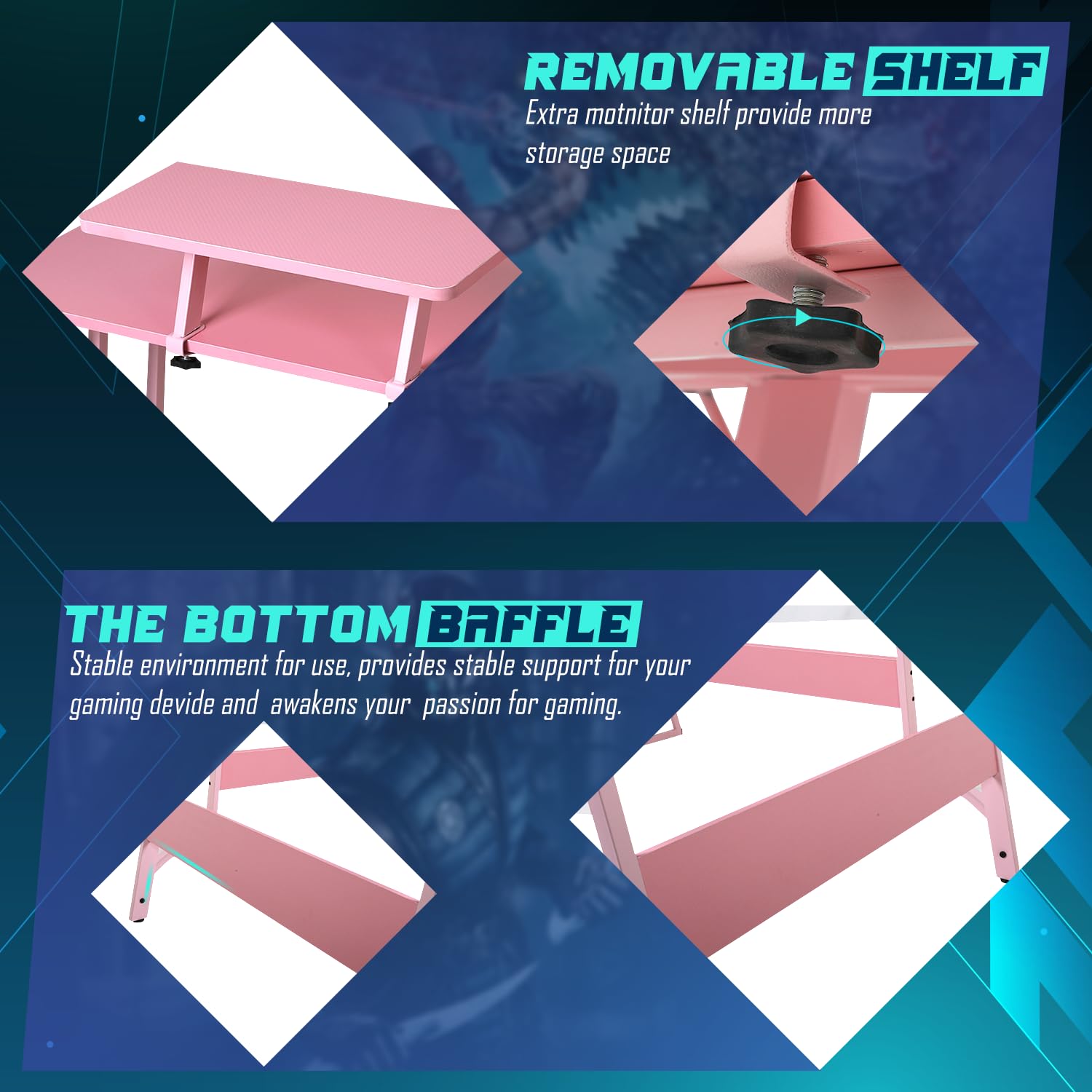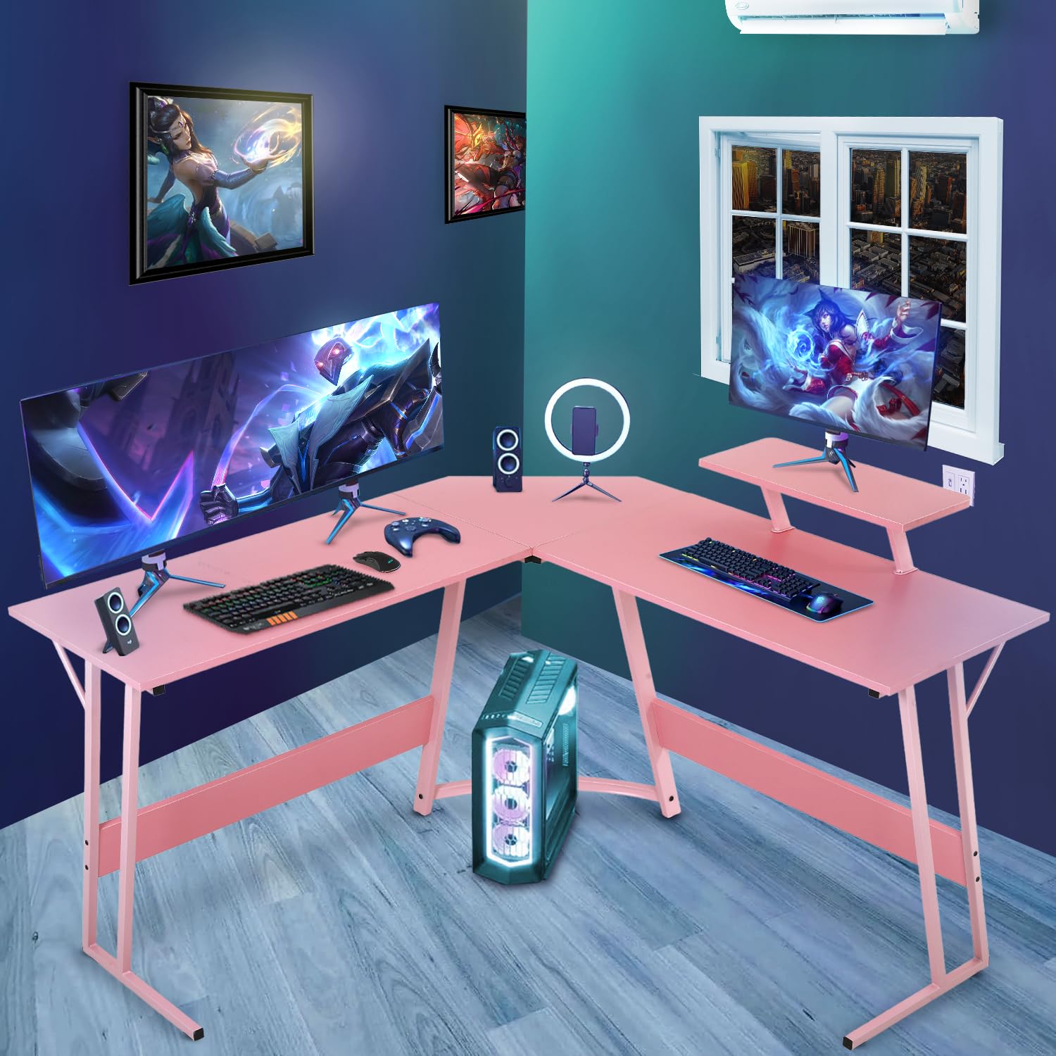 L Shaped Gaming Desk Computer Corner Desk PC Gaming Desk Table with Large Monitor Riser Stand for Home Office Sturdy Writing Workstation,Pink