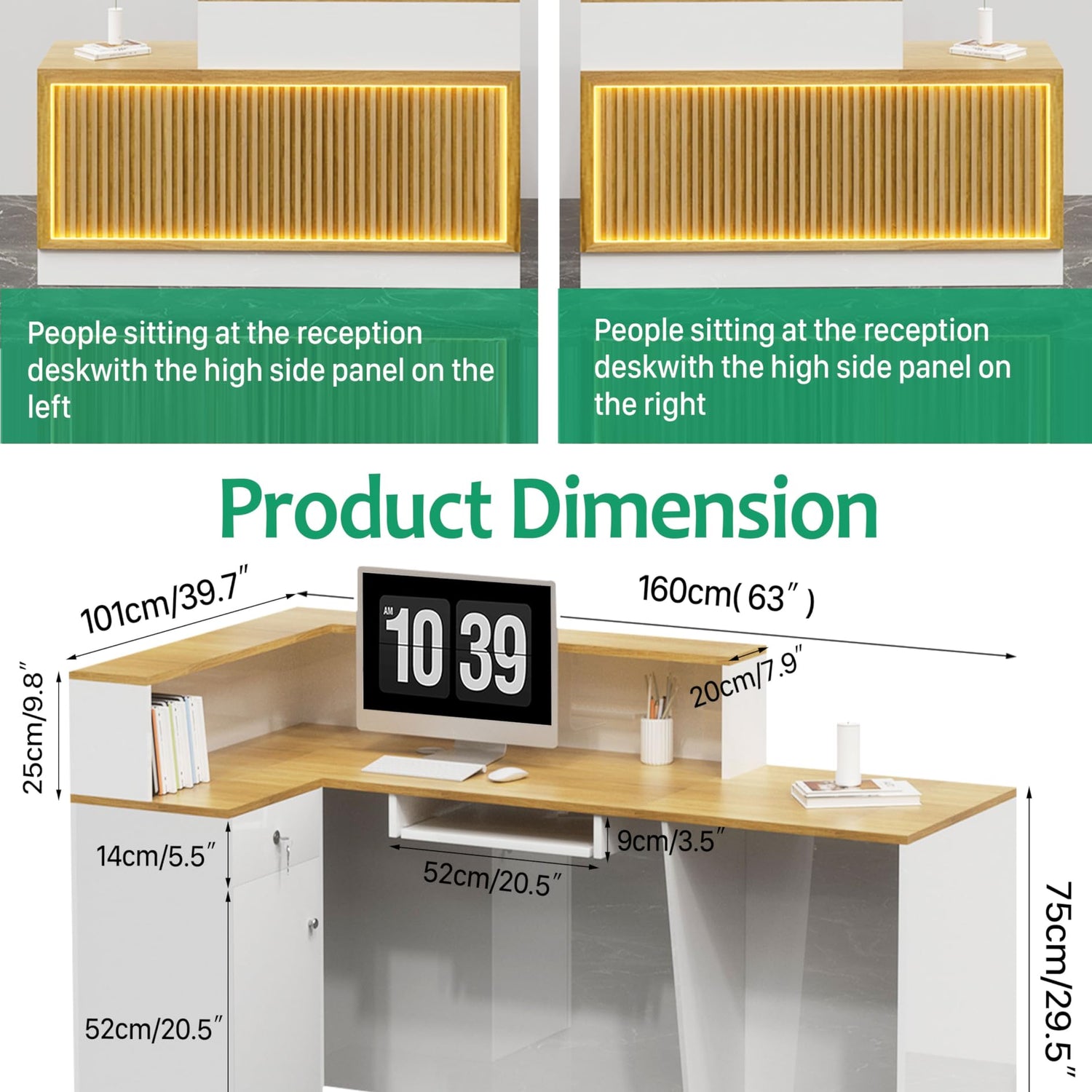 - Spacious & Versatile Design: Choose from 63-inch or 70.9-inch sizes for this L-shaped reception desk, featuring a deep 39.7-inch counter with wrap-around panels, dual-tier shelves, a lockable drawer, and storage cabinet for optimal organization. Perfect as a small reception desk or front desk reception counter, it adapts to offices, salons, or retail stores, maximizing workspace efficiency in any setting