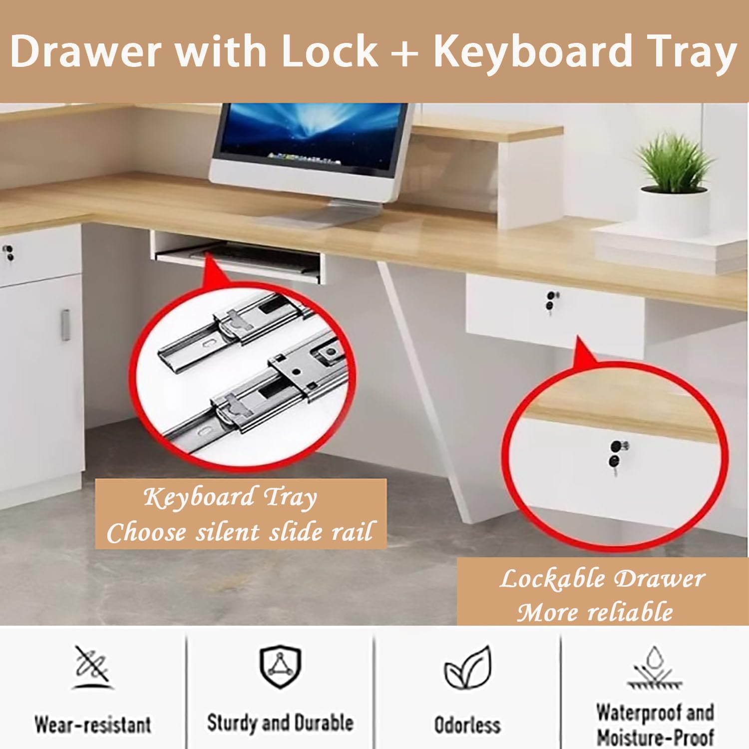 - Counter Desk Selected Hardware: The office reception desk reception table drawer is designed with a lock, so you can place private documents. The cashier desk drawer and keyboard tray use of silent slide rails ensures smooth pull-out.