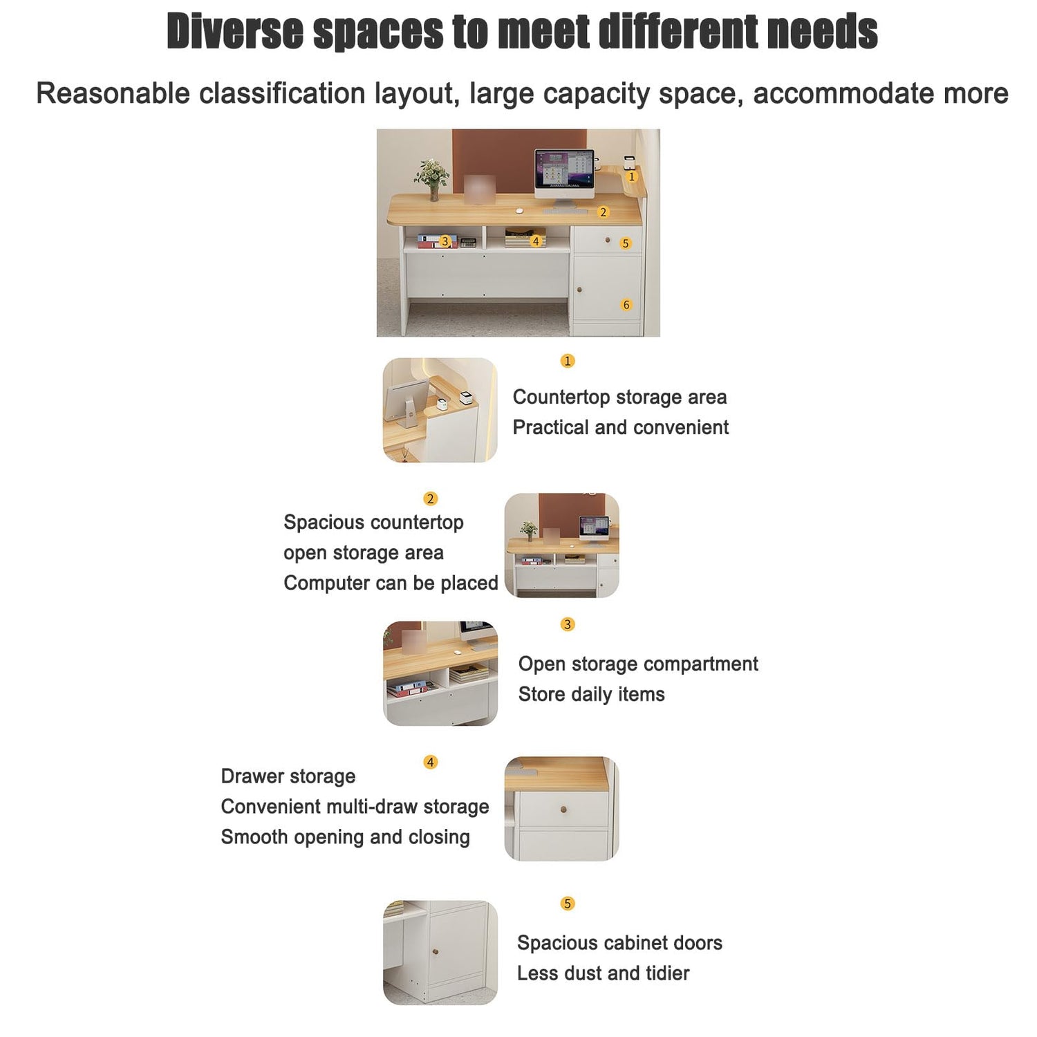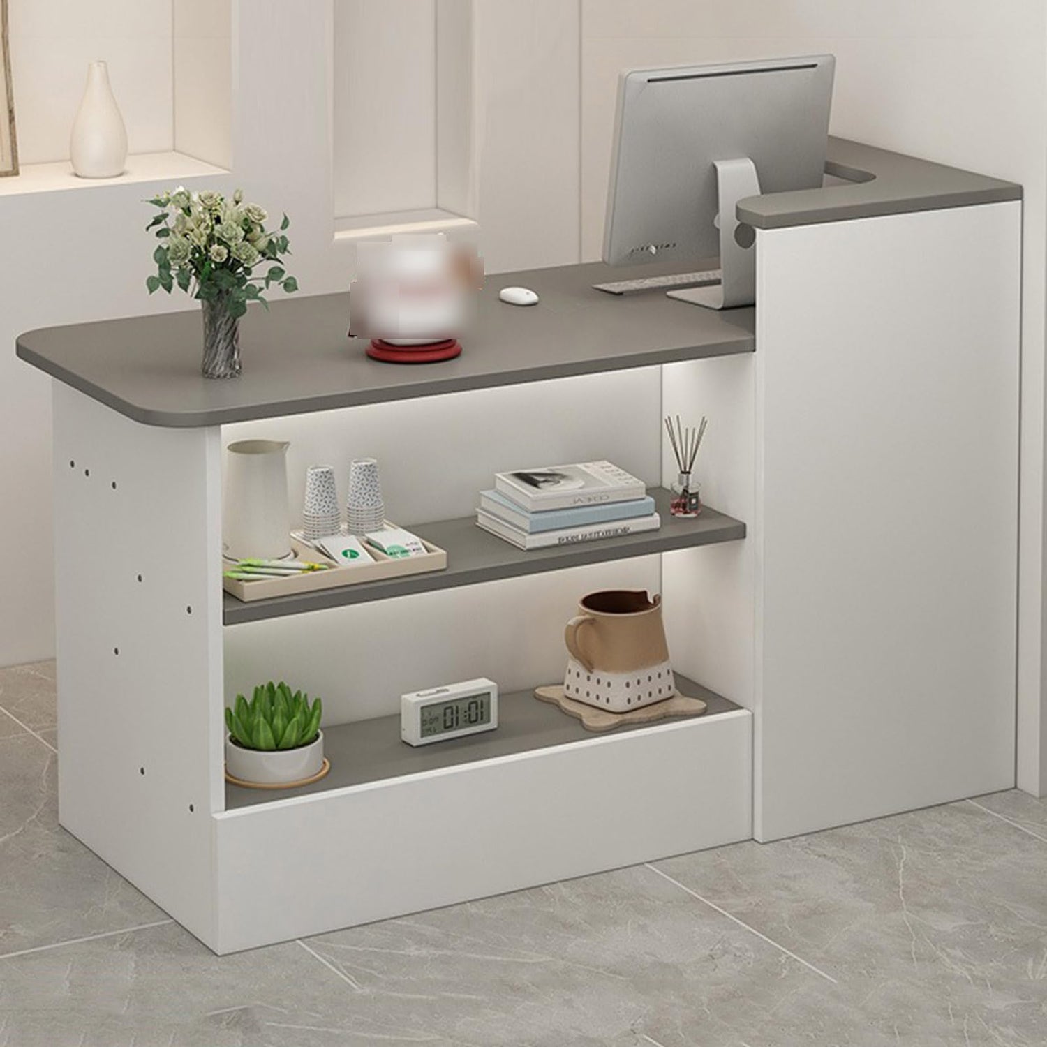 - INTIMATE DESIGN: Private drawers and filing cabinets can store personal items such as account books and documents to ensure a tidy workspace, prevent loss and provide privacy. The drawers are made of metal slides and pull out smoothly. The open storage compartment in front of the reception desk can display decorative clothing, bags and green plants, doubling your profits.