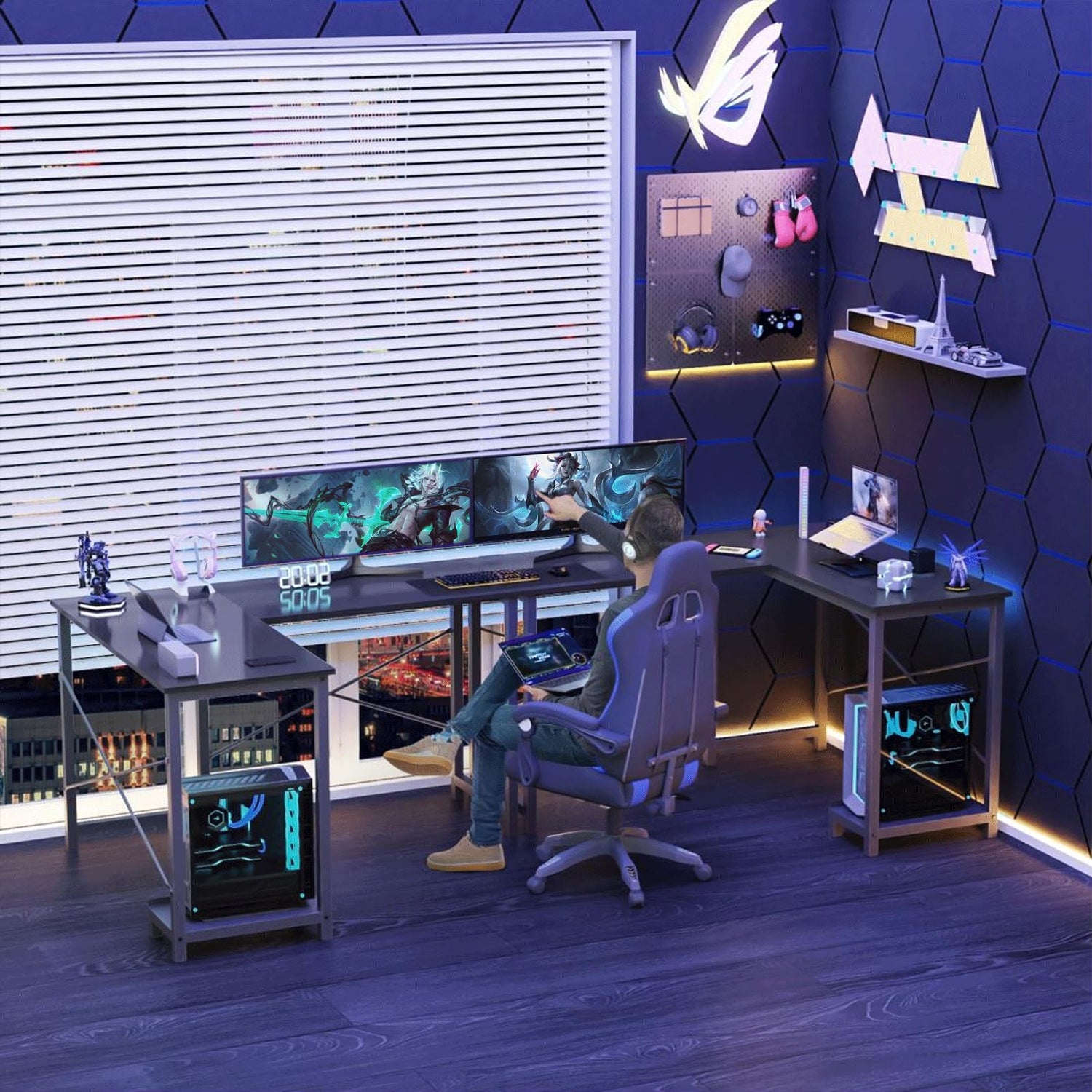 This versatile L-shaped desk is ideal for home offices, study areas, or gaming rooms. Whether you need a l shaped gaming desk, a l shaped work desk,or a black desk, this corner desk for small spaces is perfect. It's a l shaped computer desk that doubles as a great home office desk or gaming table.