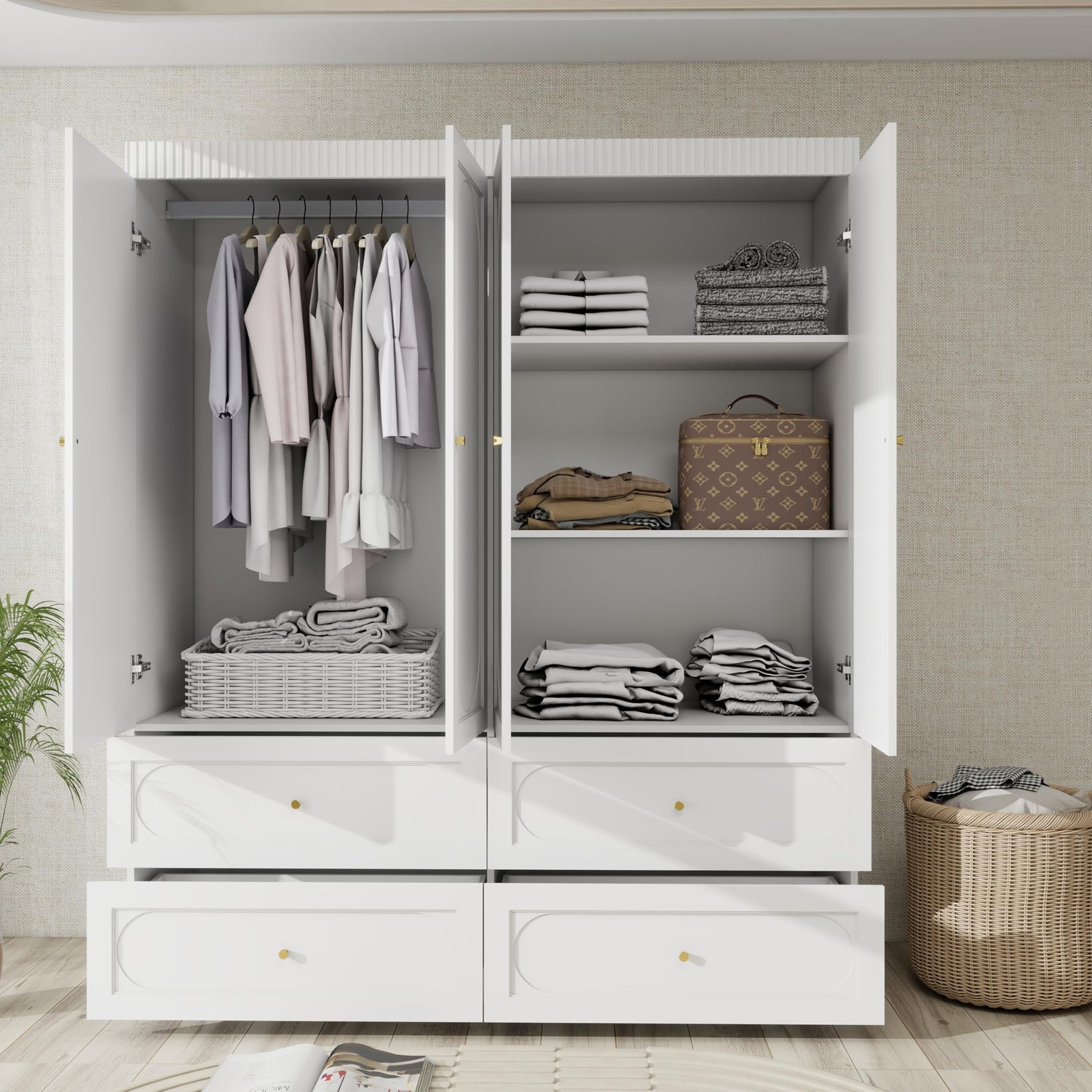 LABROSKIA Bedroom Armoire Wardrobe Closet with 4 Drawers: 74" White 4 Doors Wood Storage Cabinet, Hanging Rod and Ample Storage Space (Modern, White)