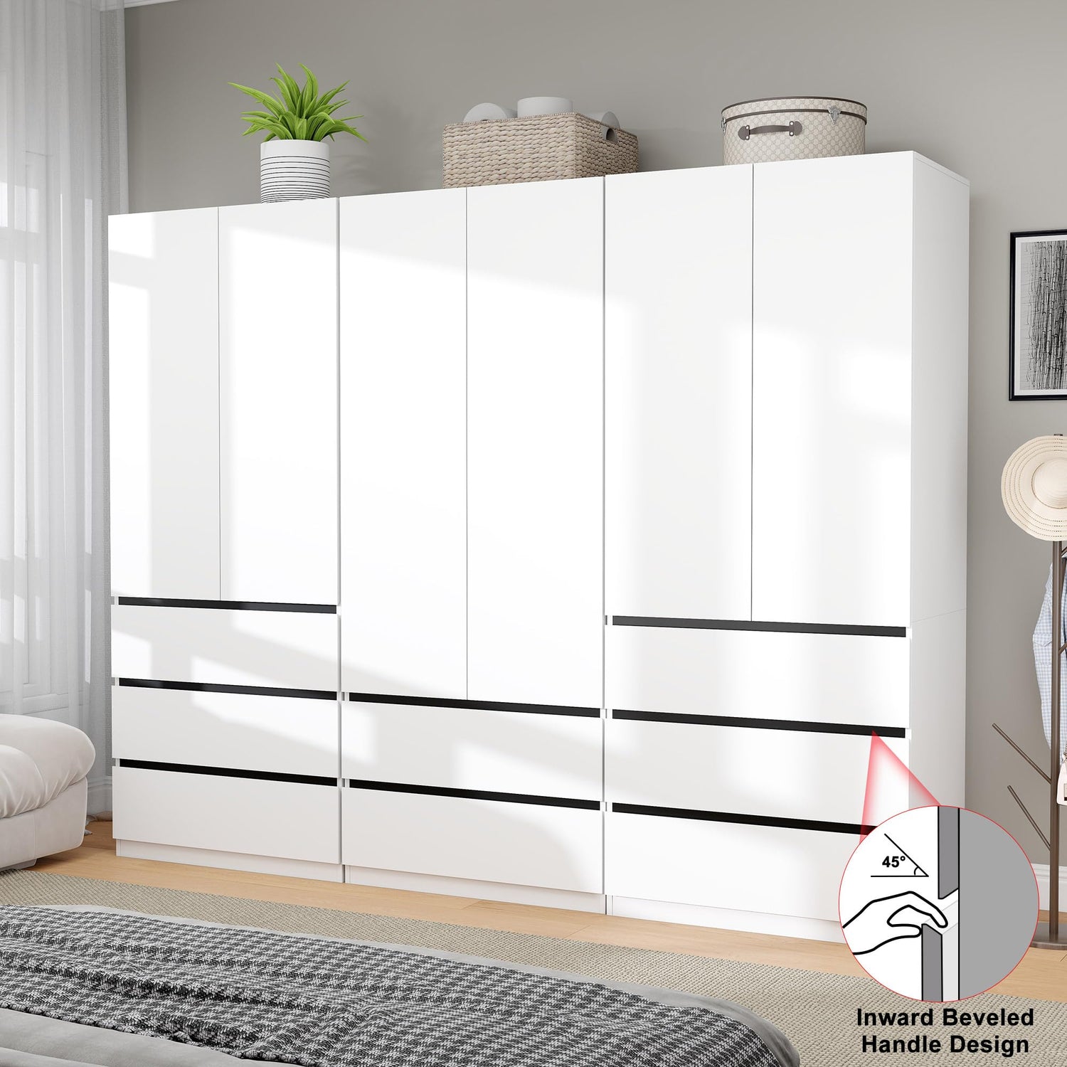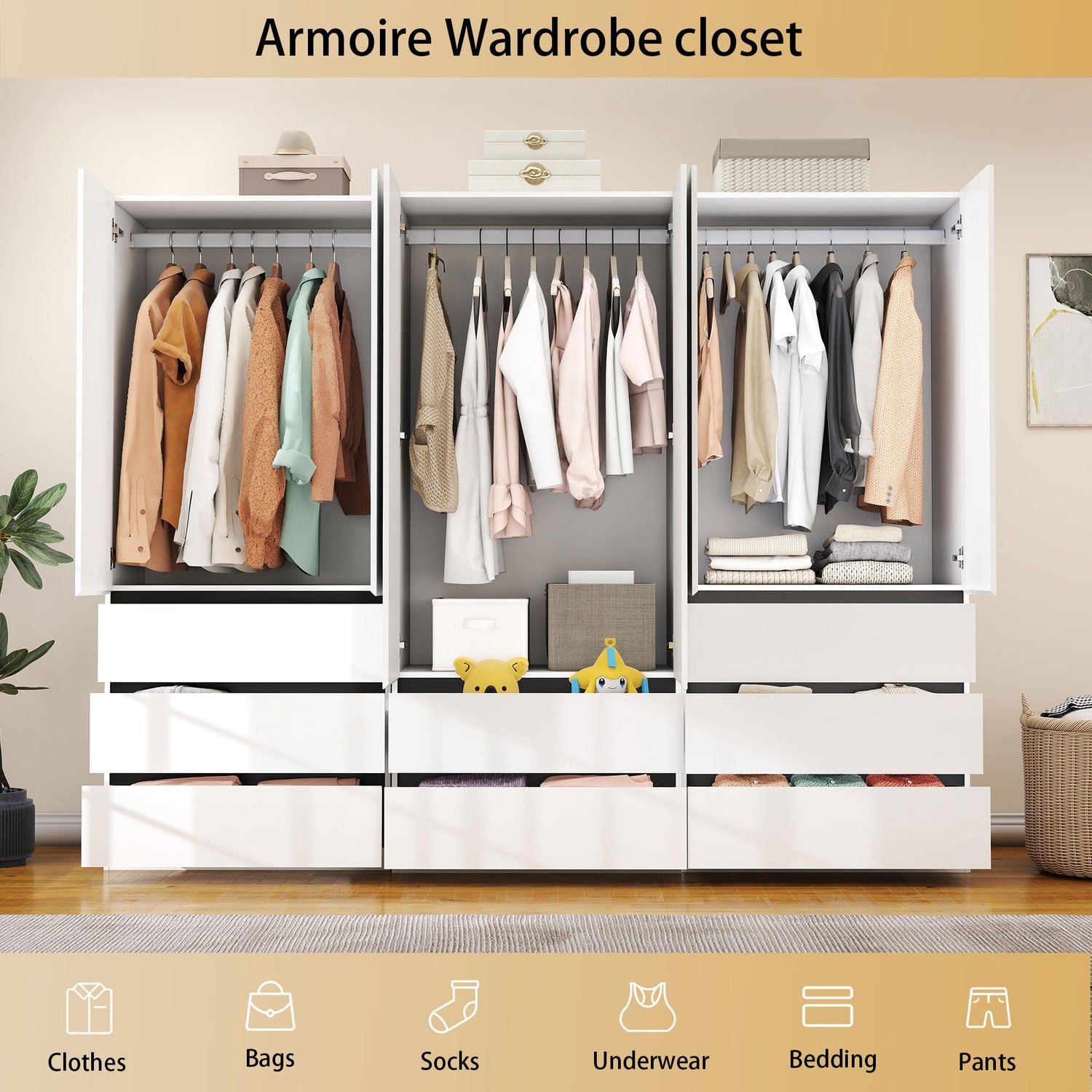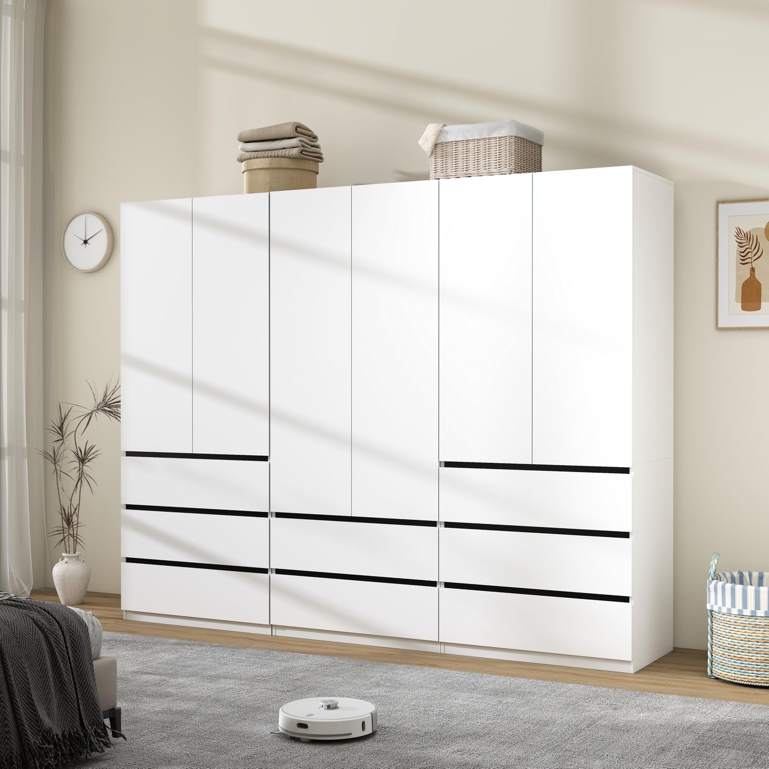 LABROSKIA Wardrobe Closet with 6 Doors: 75" White Armoire with 8 Drawers, Wooden Wardrobe for Hanging Clothes, Tall Storage Cabinet with Shelves and Hanging Rod (B+B+A, 94.5")