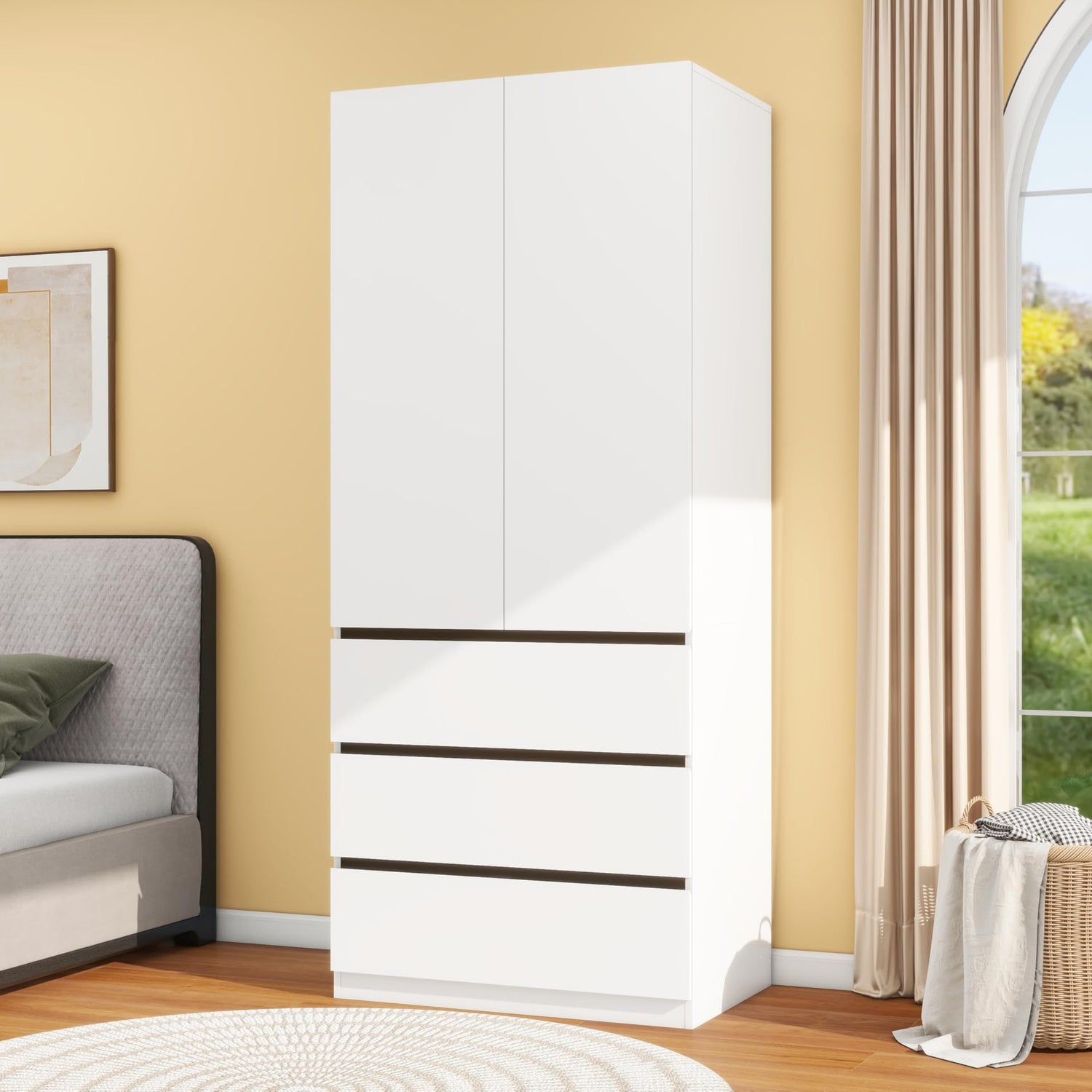 LABROSKIA Wooden Wardrobe Closet with 2 Doors: 75" Bedroom Armoire Wardrobe Closet with 3 Drawers, White Cabinet with Hanging Shelves, Large Storage Cabinet (Modern, 1)
