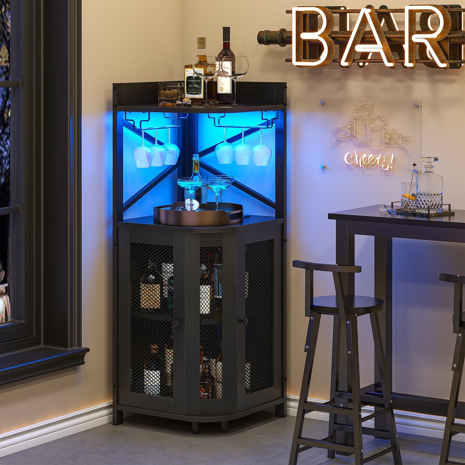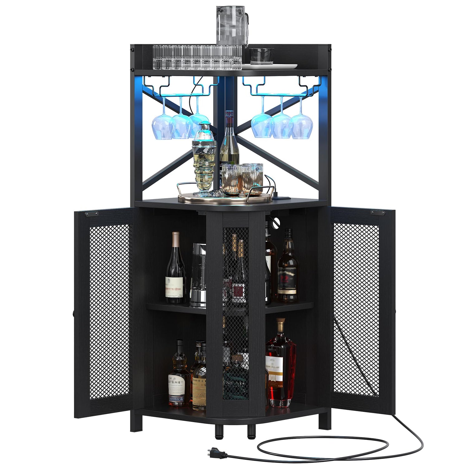 Lafnest Corner Bar Cabinet with Power Outlet and LED Light, Industrial Wine Cabinet with Glass Holder, 4-Tier Liquor Cabinet for Home, Farmhouse Home Bar for Liquor and Wine Storage, Black