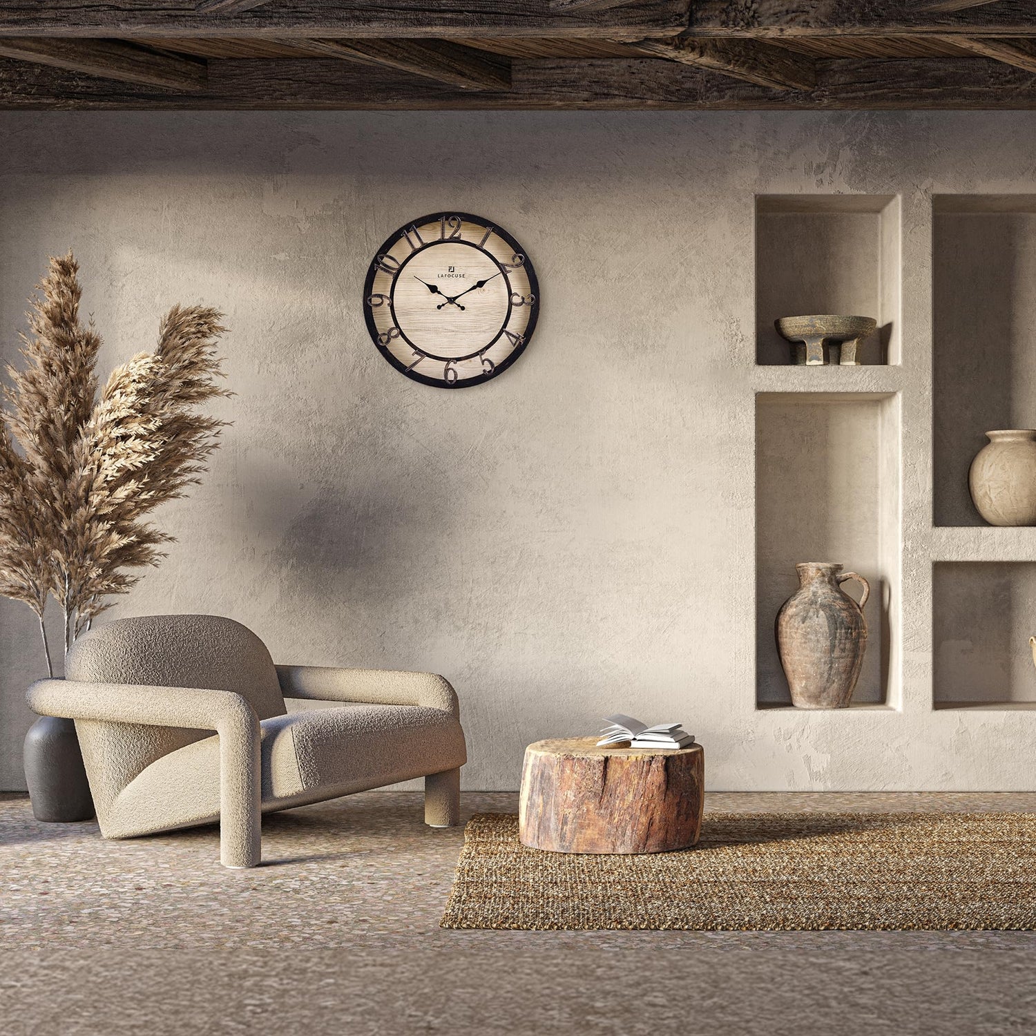 Brown wood grain dial, black hands, integrated bronze worn frame and numbers provide a shabby and vintage appearance. Whether rustic farmhouse or country cabin, this clock decorates any living space.