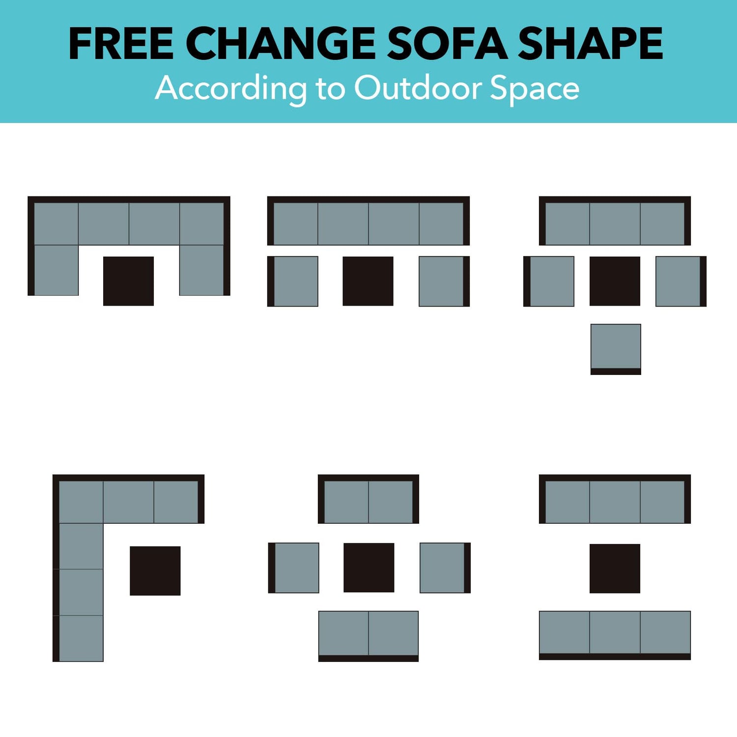 - Flexible Combination:Patio set have many configuration options based on your preference and geography.Clips connect the sectional sofa,fastening strips and velcro tapes prevent cushions from sliding.L shape feet with adjustable screw adapt to variety of different terrains or adjust sofa height.