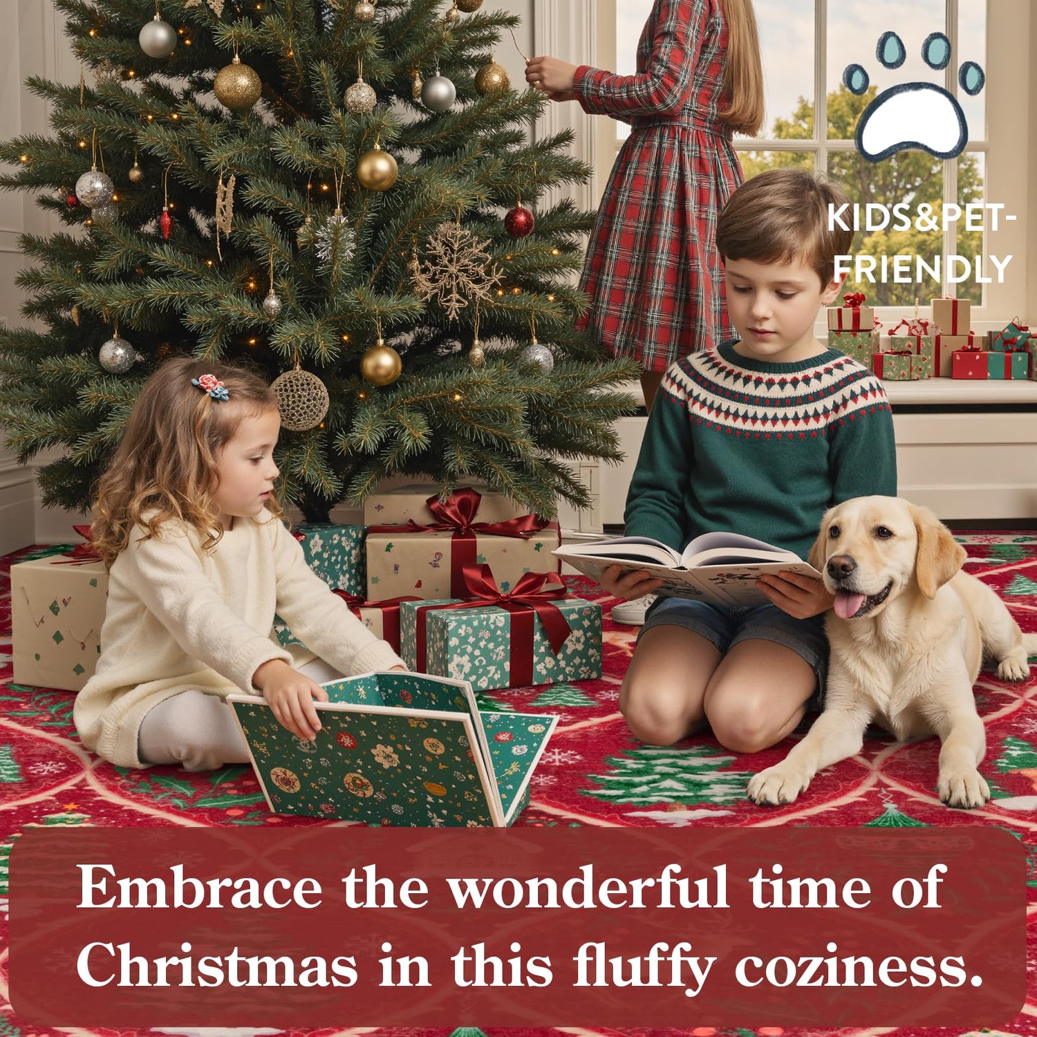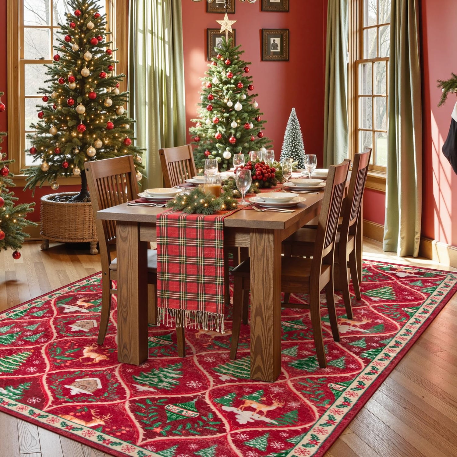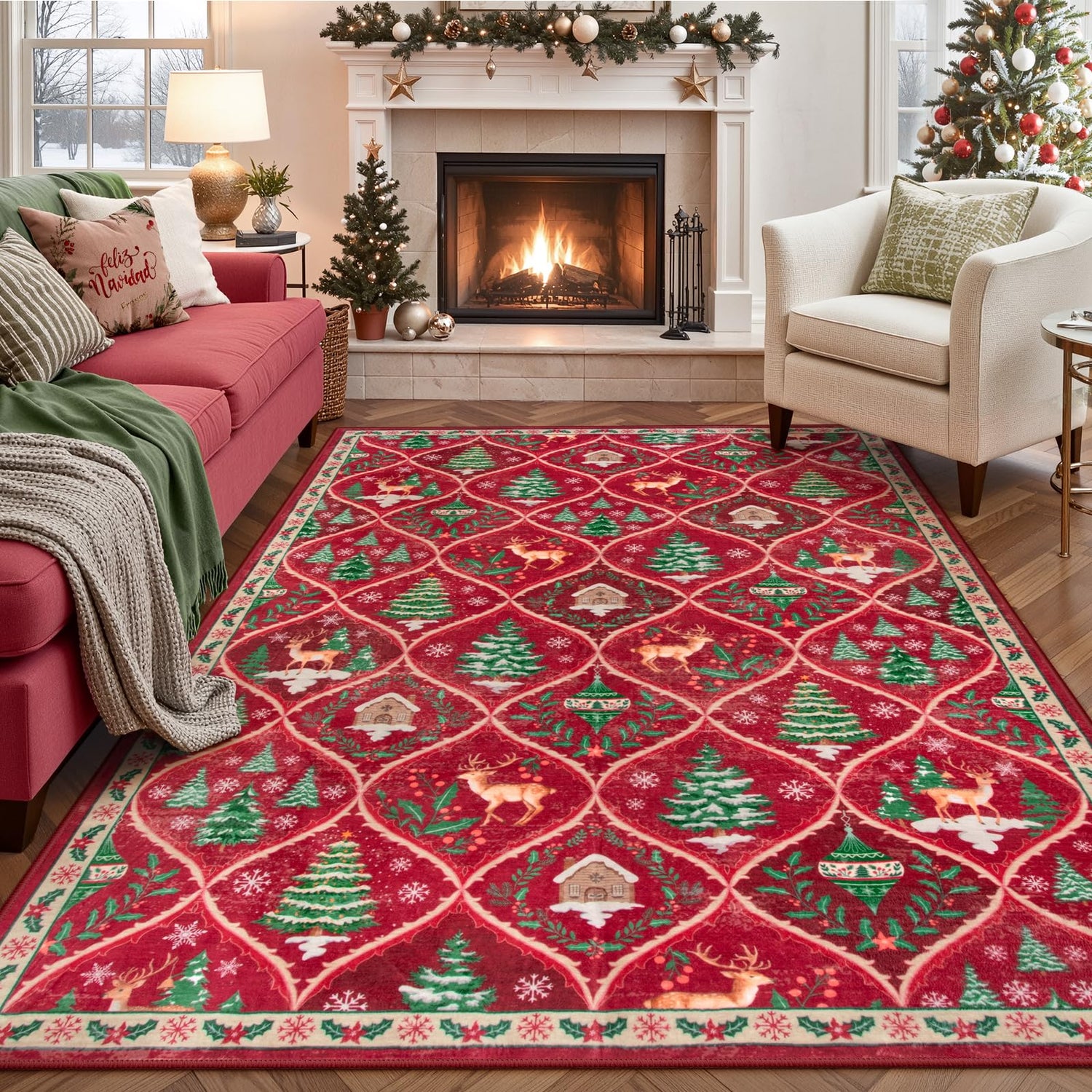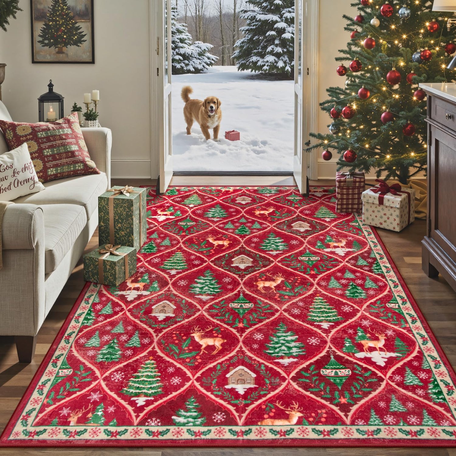 - Christmas Area Rug: Pops of reindeer, tree and so on bring this Christmas landscape to life. Warm up your home this holiday with Christmas red rugs and runners from Lahome. Get into the festive spirit