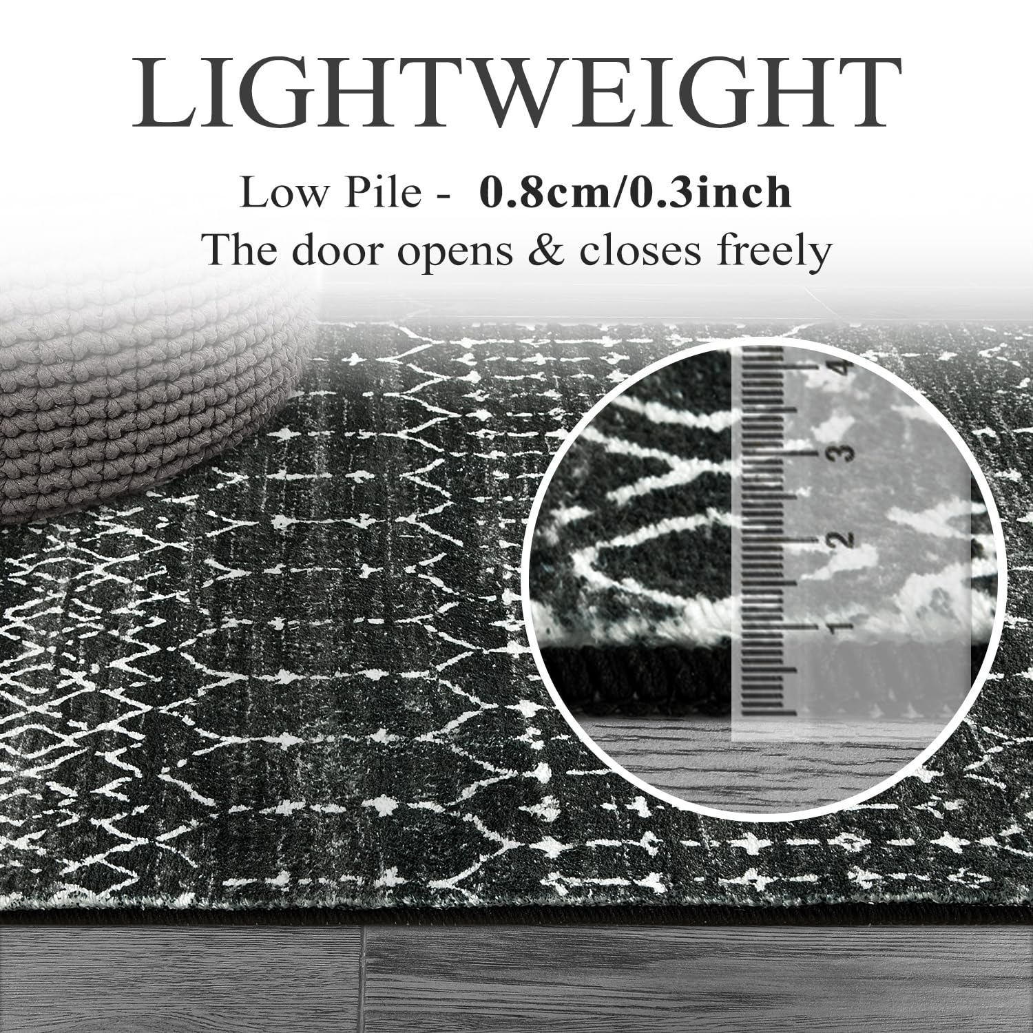 - 【Functional Lightweight Rug】 - Lahome ultra-thin rug are made with everyday use in mind and high-traffic areas. 0.3 inches thickness allows for convenient placement in entryways, kitchen, underneath furniture. The door opens and closes freely and won't create a tripping hazard.