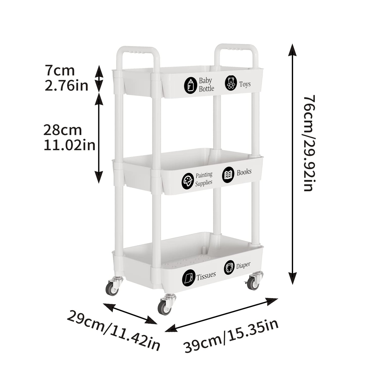 Laiensia 3-Tier Storage Cart,Multifunction Kitchen Storage Organizer,Mobile Shelving Unit Utility Rolling Cart with Lockable Wheels for Bathroom,Laundry,Living Room,With Classified Stickers,White