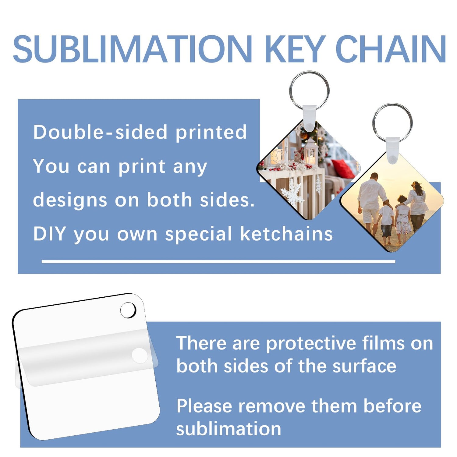 - Friendly Tips: These Sublimation key chains blanks with protective film on both sides, please remove the protective films before printing, you will get better sublimation effects. Double side perfect for sublimation projocts, you can print any designs you want.