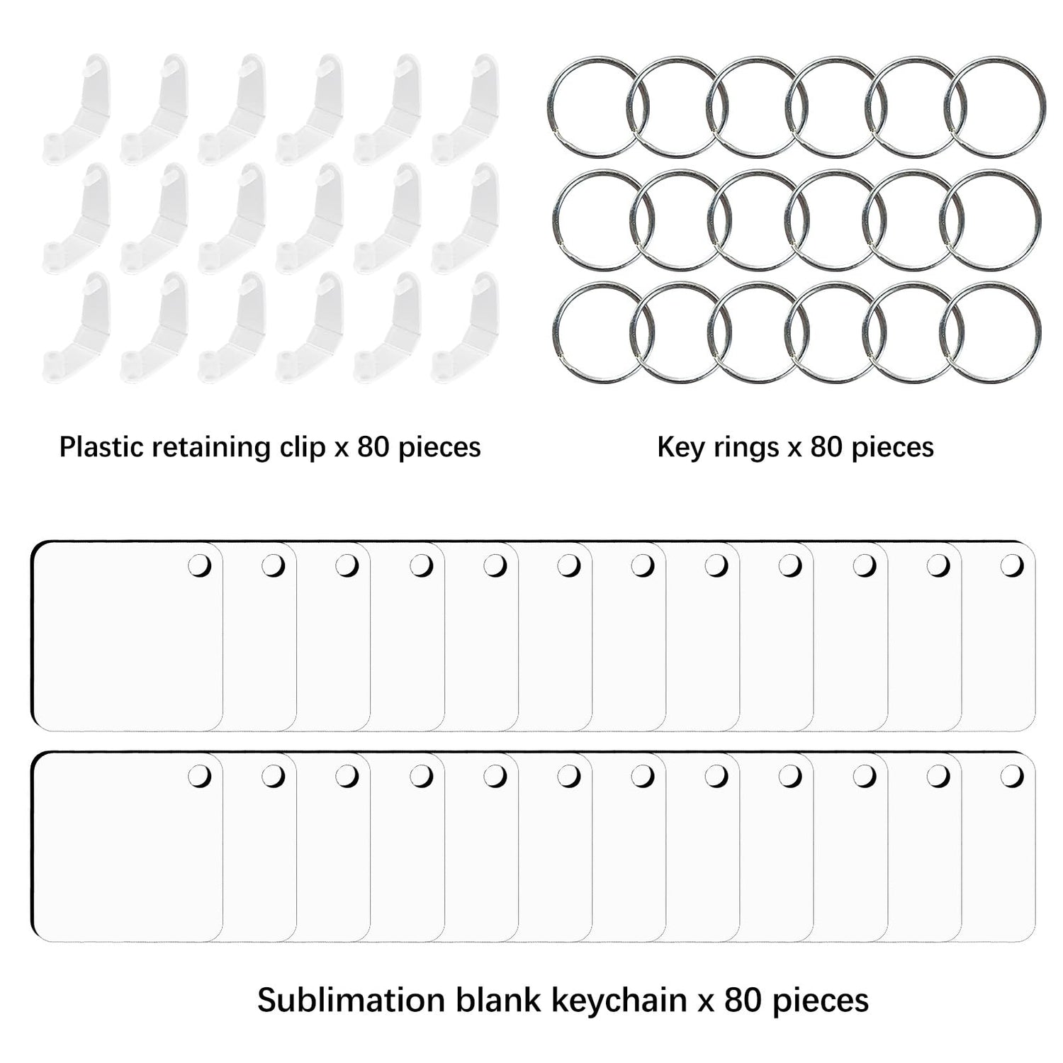 - Sublimation Keychain Blanks Bulk: You will get 80 pieces double sides MDF square sublimation keychain blanks with 80 pcs key rings and 80 pcs plastic clips in 1 set. Large quantity that you can DIY keychains for yourself or be a good gift to friends.