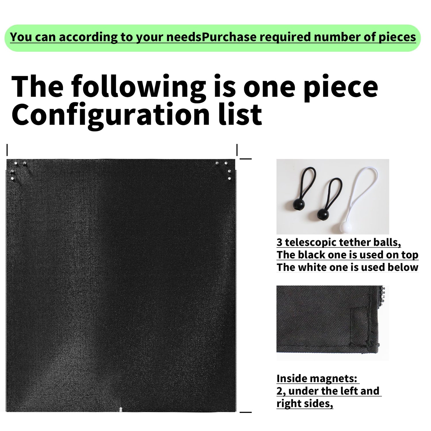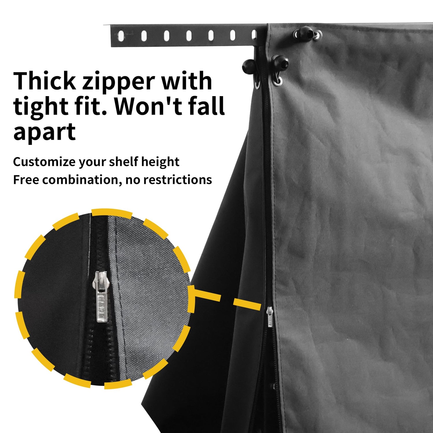 Details: This is a smartly designed garage storage rack cover, each cover is 48 inches wide and 40 inches tall, equipped with 4 black ball elastic straps and 1 white ball elastic strap. It can be freely adjusted between 22-40 inches in height according to the actual height of your shelf, and is equipped with white ball elastic straps at the bottom of the storage shelf cover, and magnets on the left and right to assist in adsorbing to the storage shelf, allowing the cover to Better fit. On the top of the storage shelf cover, we have reserved 8 holes. Whether the shelf beams are installed horizontally or vertically, they can be flexibly locked with black ball elastic straps. Most importantly, we are equipped with universal zippers on the side of each ceiling shelf cover. You can choose the corresponding quantity according to the size of your shelf, and connect each cover with a zipper!
