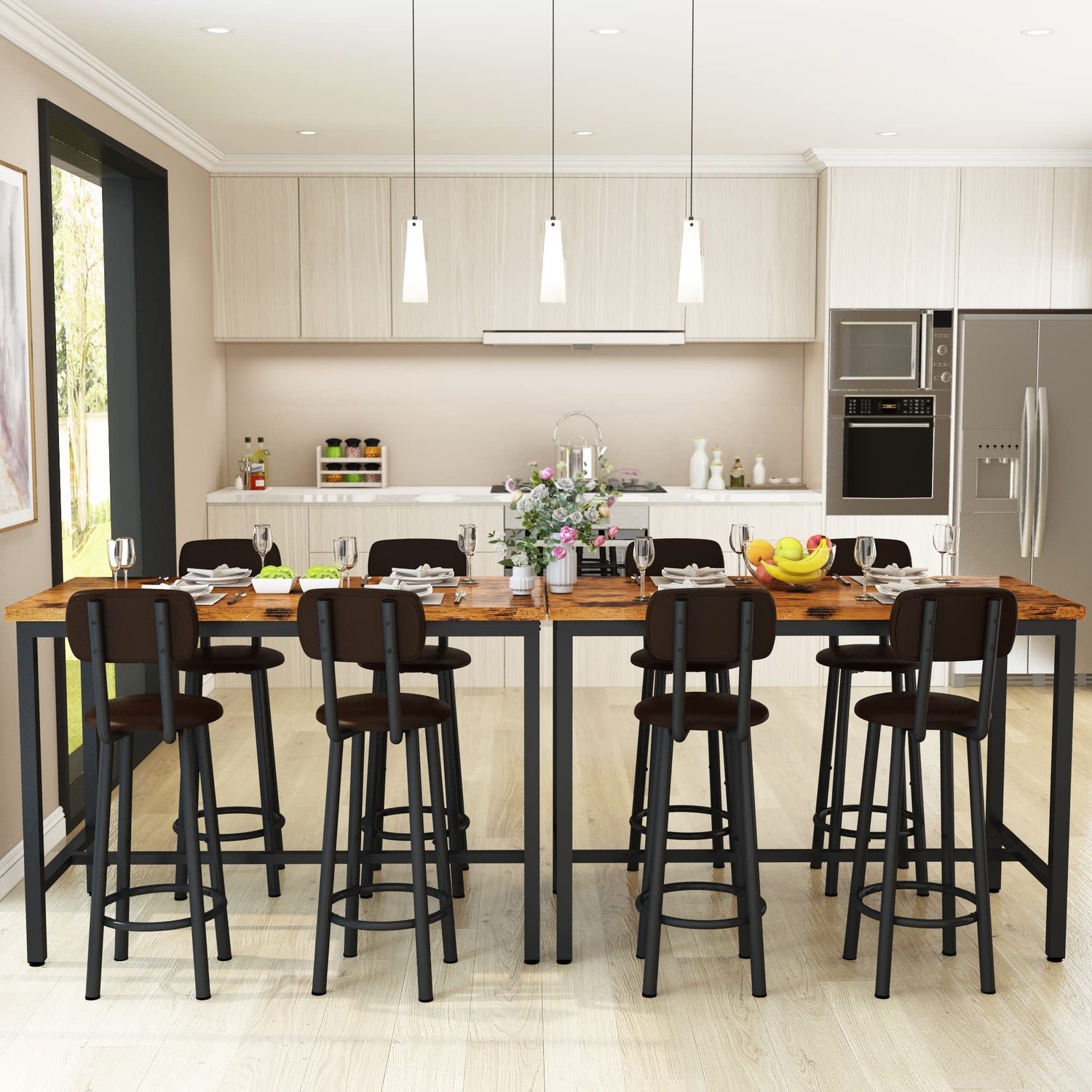 Designed with space-saving and ergonomic considerations, this dining set functions both as a compact countertop and a dining table, tailored for limited spaces. The four bar stools, standing at a convenient height of 23.8 inches, slide neatly underneath the table when not in use, enhancing your space's efficiency without sacrificing style. Each stool features a thoughtfully designed backrest and footrest, delivering optimal comfort during meals and gatherings.