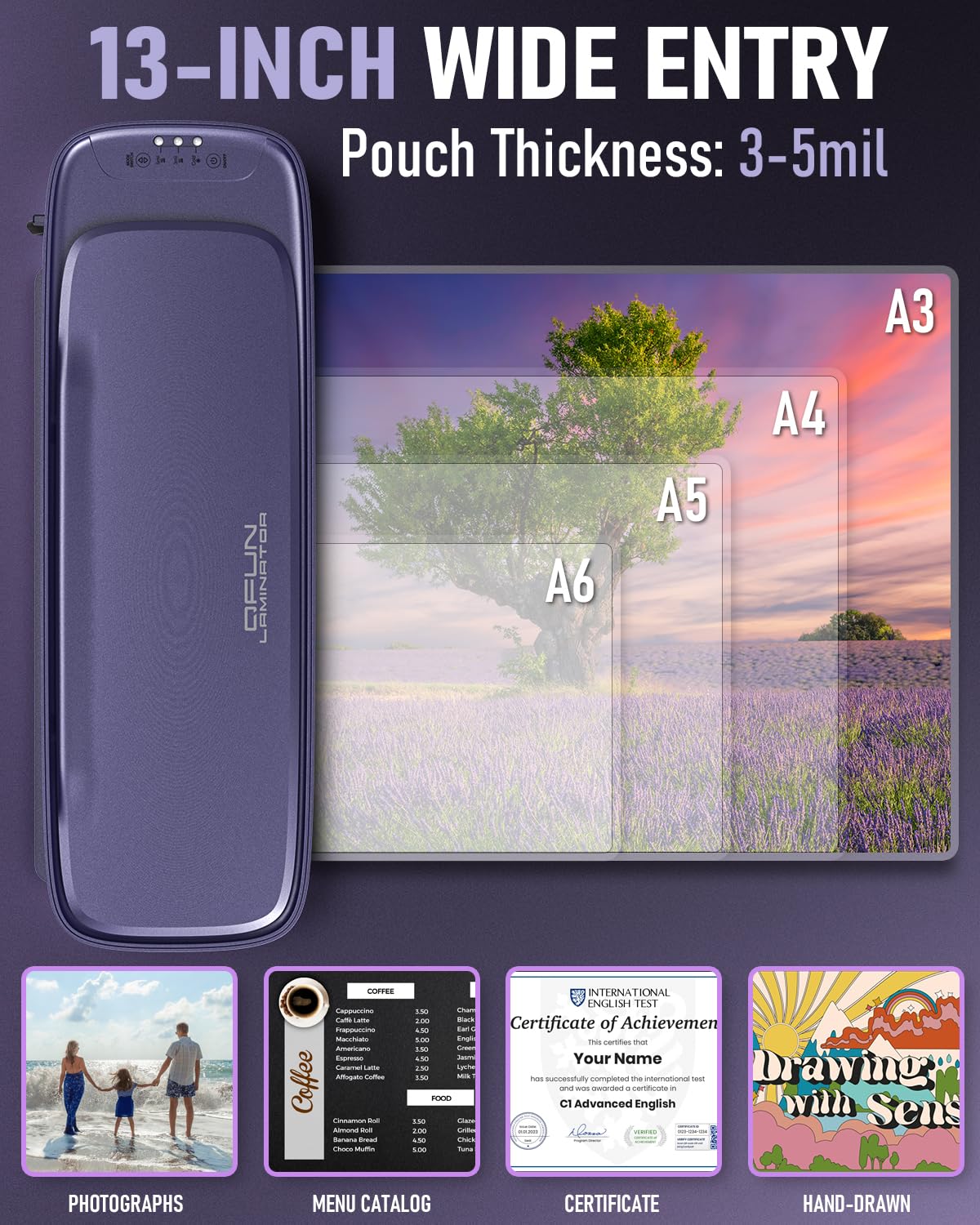 - 2025 New Upgraded 9-in-1 Lamination Machine: Crafted with high-molecular construction materials for unparalleled durability, our QFUN laminator comes in cool colors that make it a stylish addition to your studio. Dive into endless possibilities with our thermal laminator, which includes a built-in 1*paper cutter, 1*corner rounder, 1*hole punch, 3*binder rings, and 30 sheets of 3 mil laminating paper (including 3A3, 9A4, 9A5, 9A6). Everything you need to kickstart your laminating journey is right here