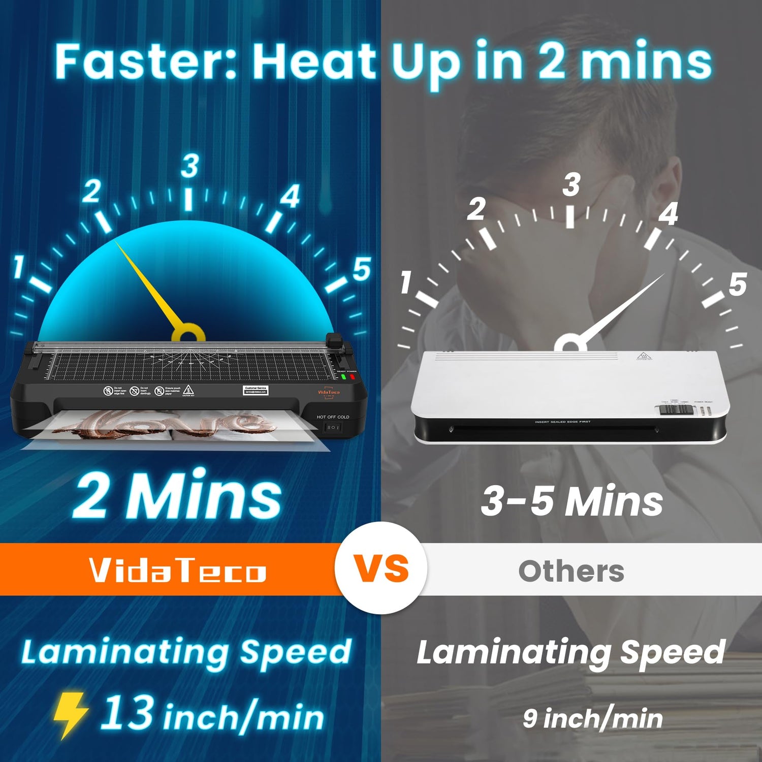 - 2 Mins Warm Up: This laminator machine features extra fast 2-minute heat up time and 13 inches per minute faster laminating speed, make your laminating work more efficient