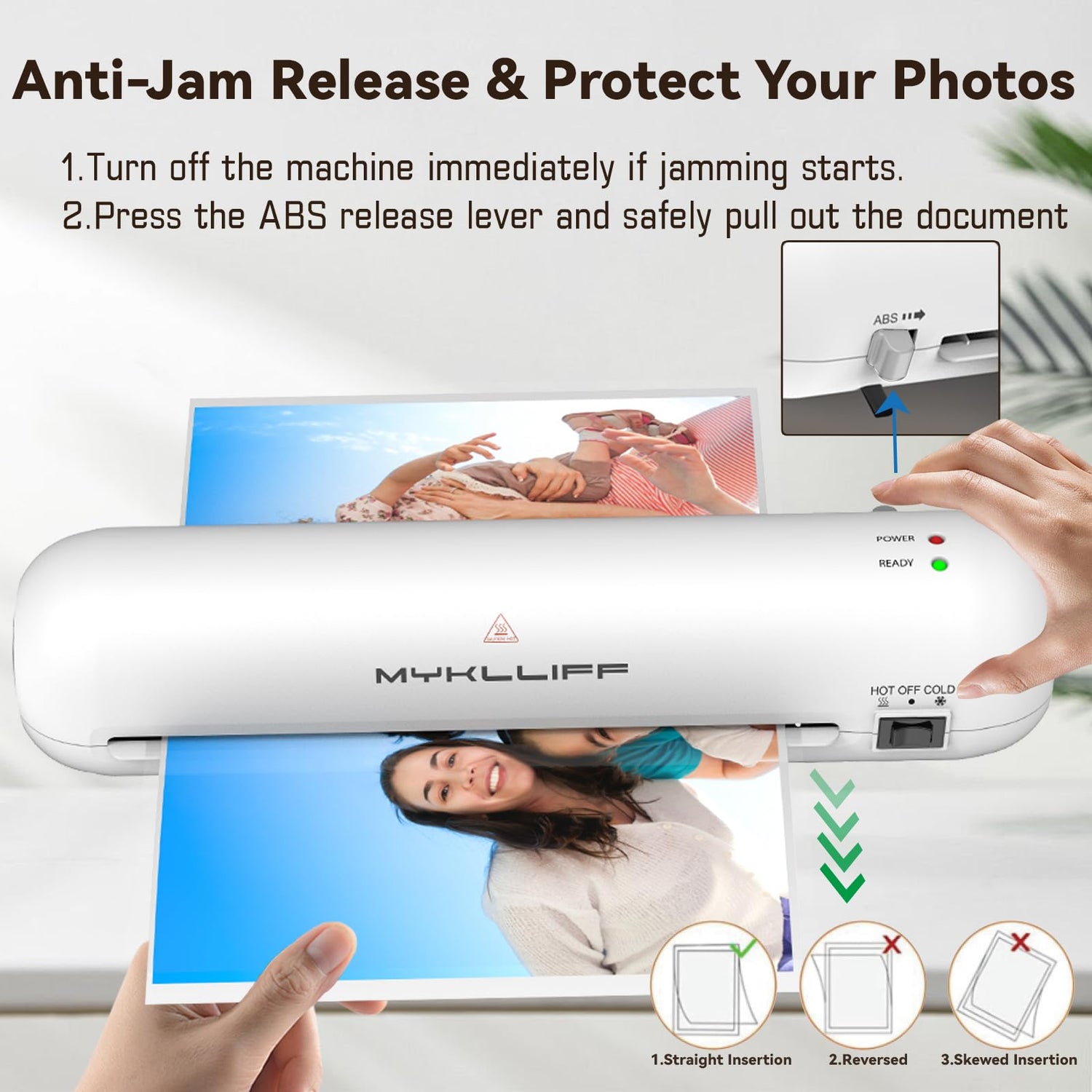 - Say Goodbye to Jammed Papers and Frustration: We’ve all been there: a jammed laminator ruining your important project. With the ABS Jam-Release button, you’ll never feel that stress again. Quickly fix jams and protect your documents without tearing or crinkling. To avoid jams: Ensure the sealed edge of the pouch enters first. Avoid using pouches that are too thick or thin (use 3-4.5 mil pouches for the best results).