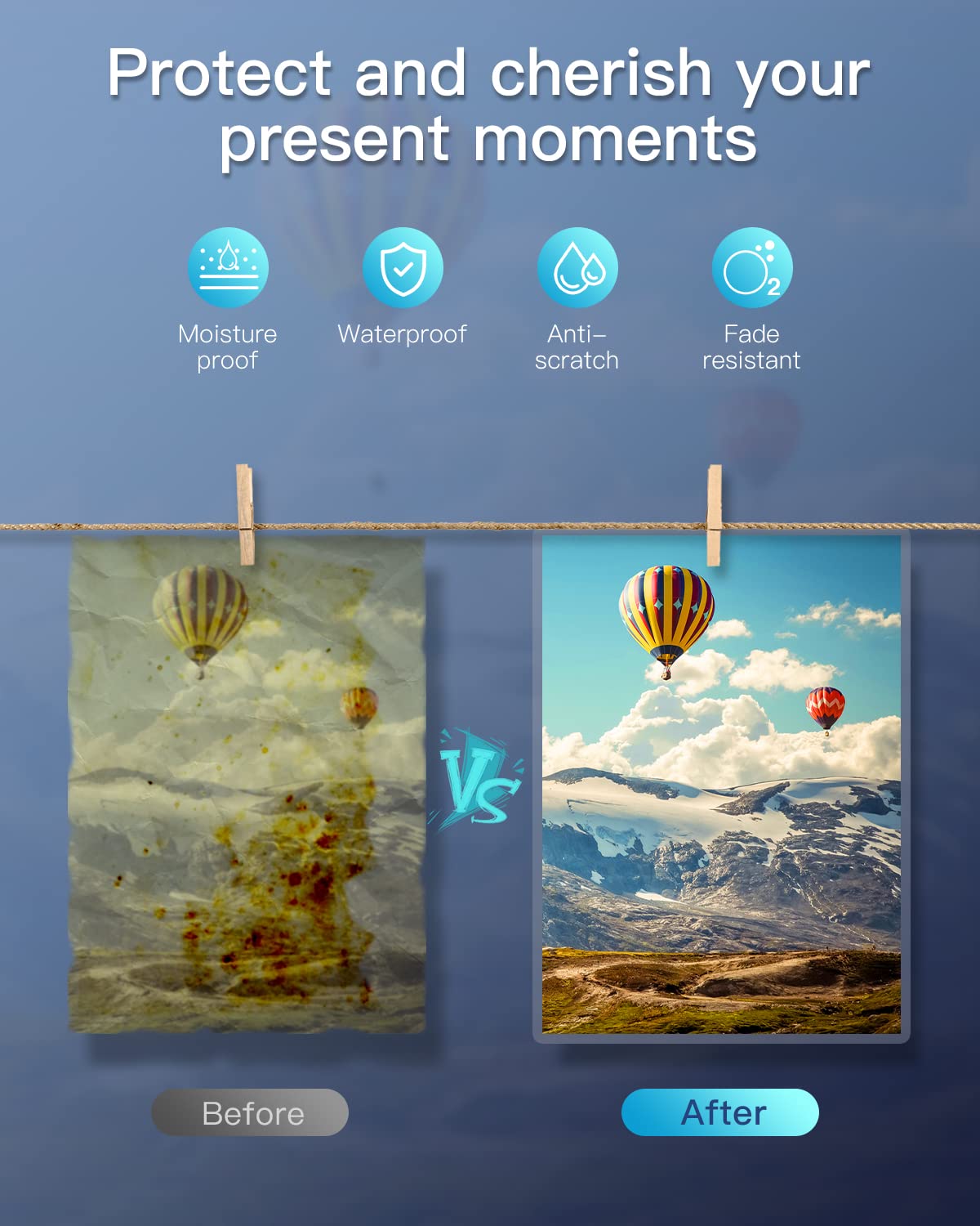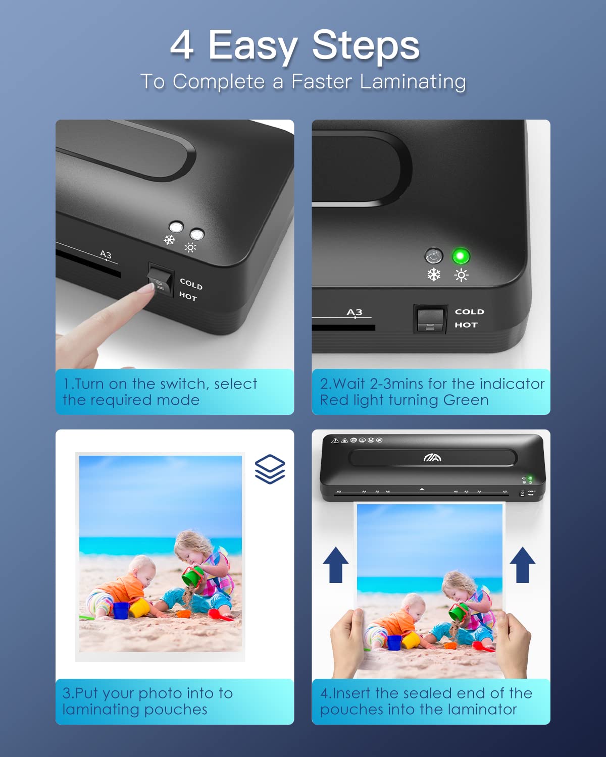 - Versatile Laminator for A3/A4/A5/A6 Sizes: Measuring 16.85 x 4.8 x 2.56 inches, this laminator machine with laminating sheets handles pouches up to 13 inches wide (laminator A3) and 2.5-4 mil (60-100 mic) thick. With a maximum operating temperature of 293°F, it’s perfect for photos, cards, certificates, menus, and more