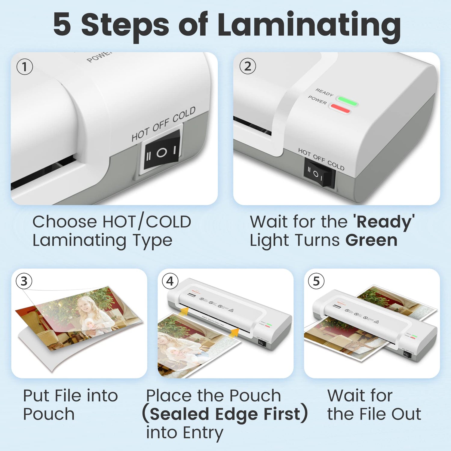 - Wider Usages with HOT, COLD Modes: The personal lamination machine is equipped with Thermal and Cold laminating modes. You can laminate precious photos, menus, school documents, certifications, legal letters, business cards, postcards, etc. under HOT Setting. Also, for the heat sensitive items, please choose COLD Setting
