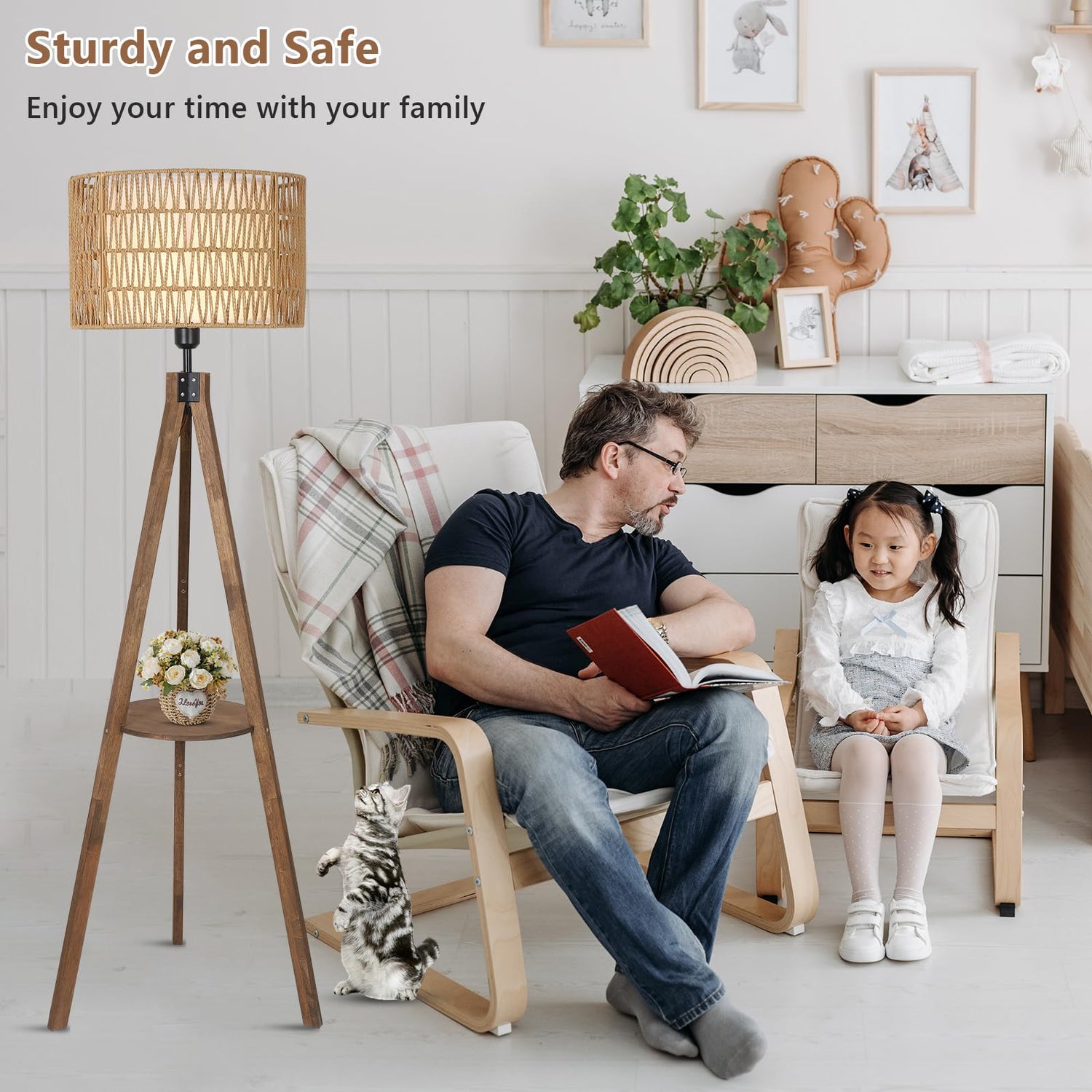 LAMSU Boho Tripod Floor Lamps for Living Room, Rattan Wood Floor Lamp with Fabric Shades, Mid Century Standing Lamp with Shelf, Foot Switch, Modern Farmhouse Tall Lamps for Bedroom Office Brown