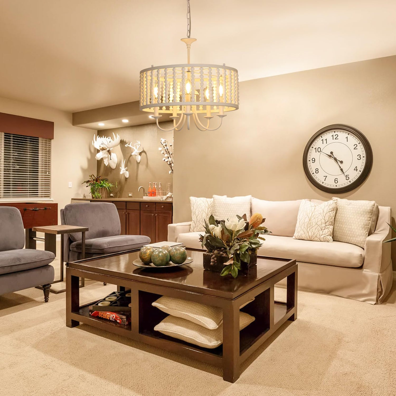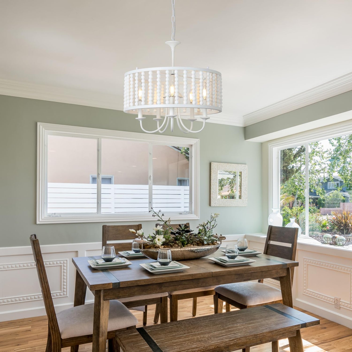 LAMSU Farmhouse Chandeliers for Dining Room, 5-Light Boho Wood Chandelier Light Fixture with Solid Wooden Beaded Shade, Modern Drum Chandeliers for Living Room Kitchen Island Bedroom Foyer, White