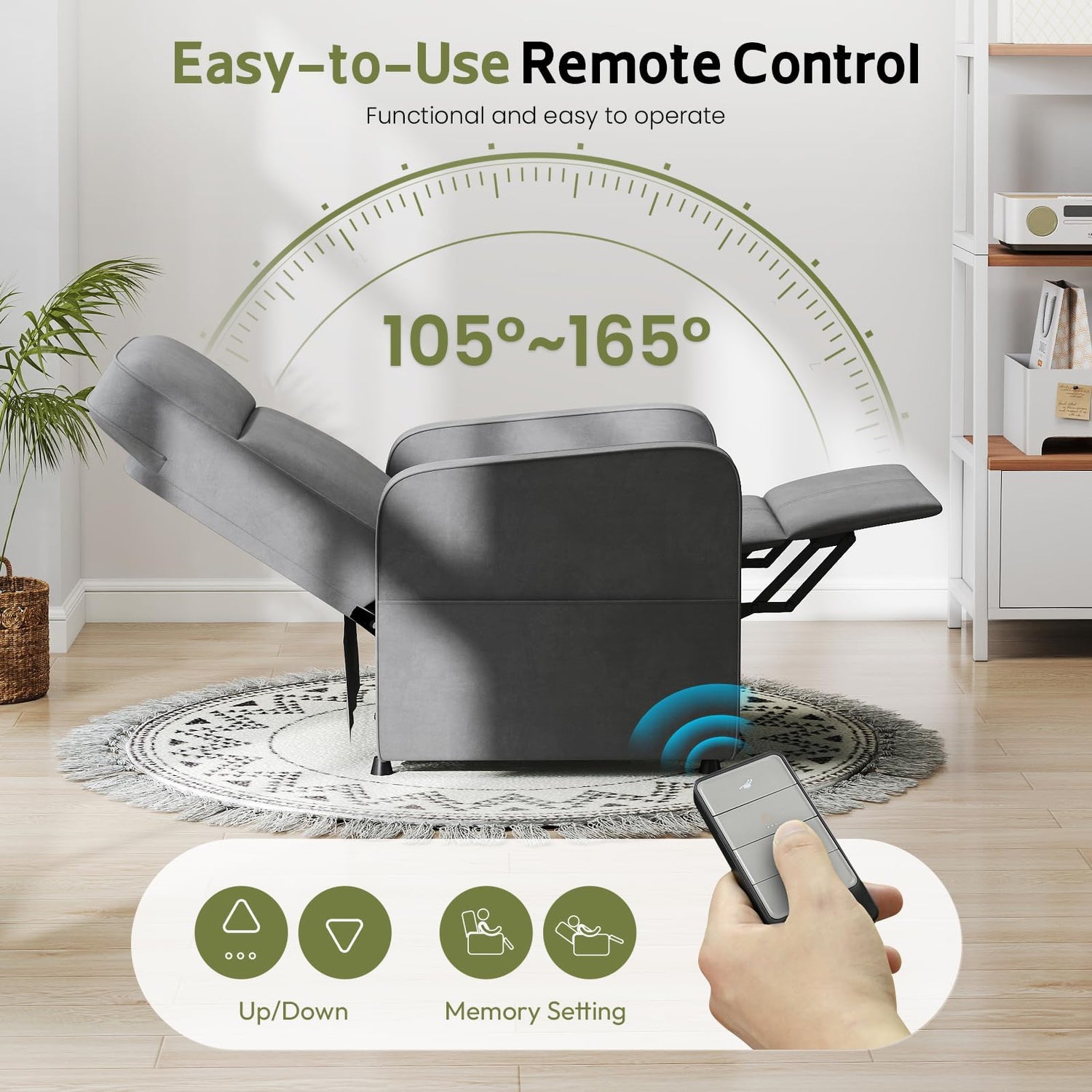 - Convenient Storage & Memory Control: Dual side pockets keep your phone, books, remote, and other essentials within easy reach. The remote control includes a memory function to save your favorite recline position. A padded seat, backrest, and footrest enhance comfort while you read, relax, or watch TV