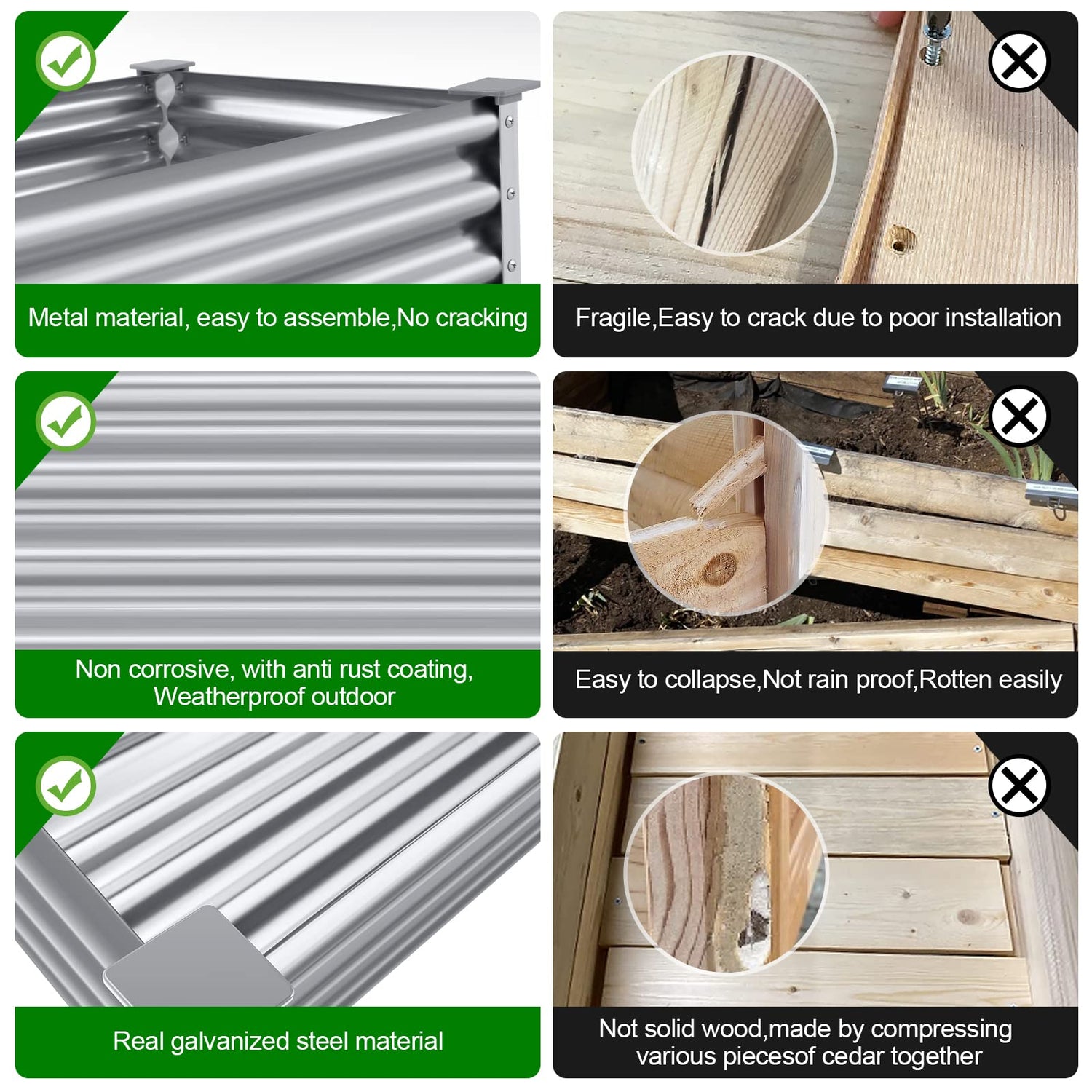 - Unique design: raised garden beds outdoor for vegetables, it is our custom-designed style The upper part of the garden bed is galvanized sheet, the middle bottom plate is a stainless steel shelf, and the lower 4 legs are aluminum alloy legs, which are more durable than wooden and anti-rust performance keeps it in the best condition for a long time. The 4 corners above and below the raised garden bed are protected with pads, which not only effectively prevent sharp corners from poking people, but also prevent the floor from being scratched.. The garden box is exquisite and stylish, it brings great convenience to our planting life.