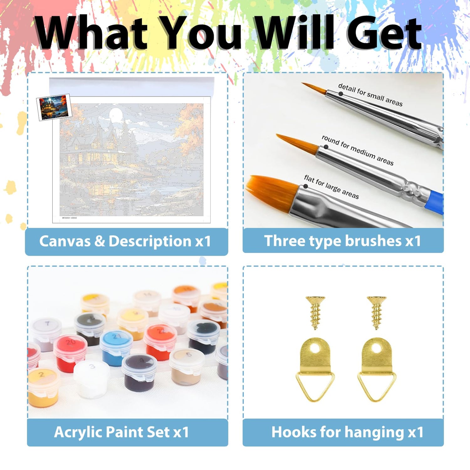 - What You Get - With landscape paint by numbers for adults, you will get: 1 high-quality, soft, waterproof canvas, 1 set of perfectly matched acrylic paints,1 set of high-quality brushes (including large and small brushes), and reference pictures of finished products.
