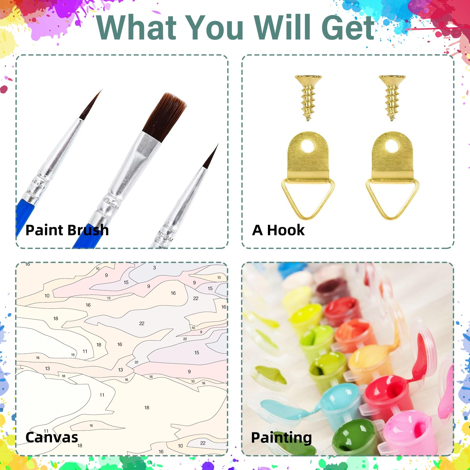 - Quality Canvas and Acrylic Paint: Our paint by number kit for adults comes with a smooth and clean canvas with clear outlines for easy identification. The environmentally friendly acrylic paints provide full bright color and are quick-drying with strong coverage.