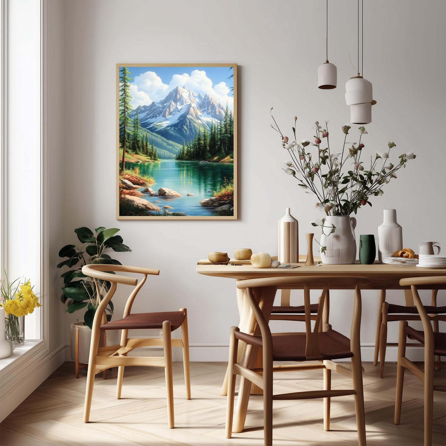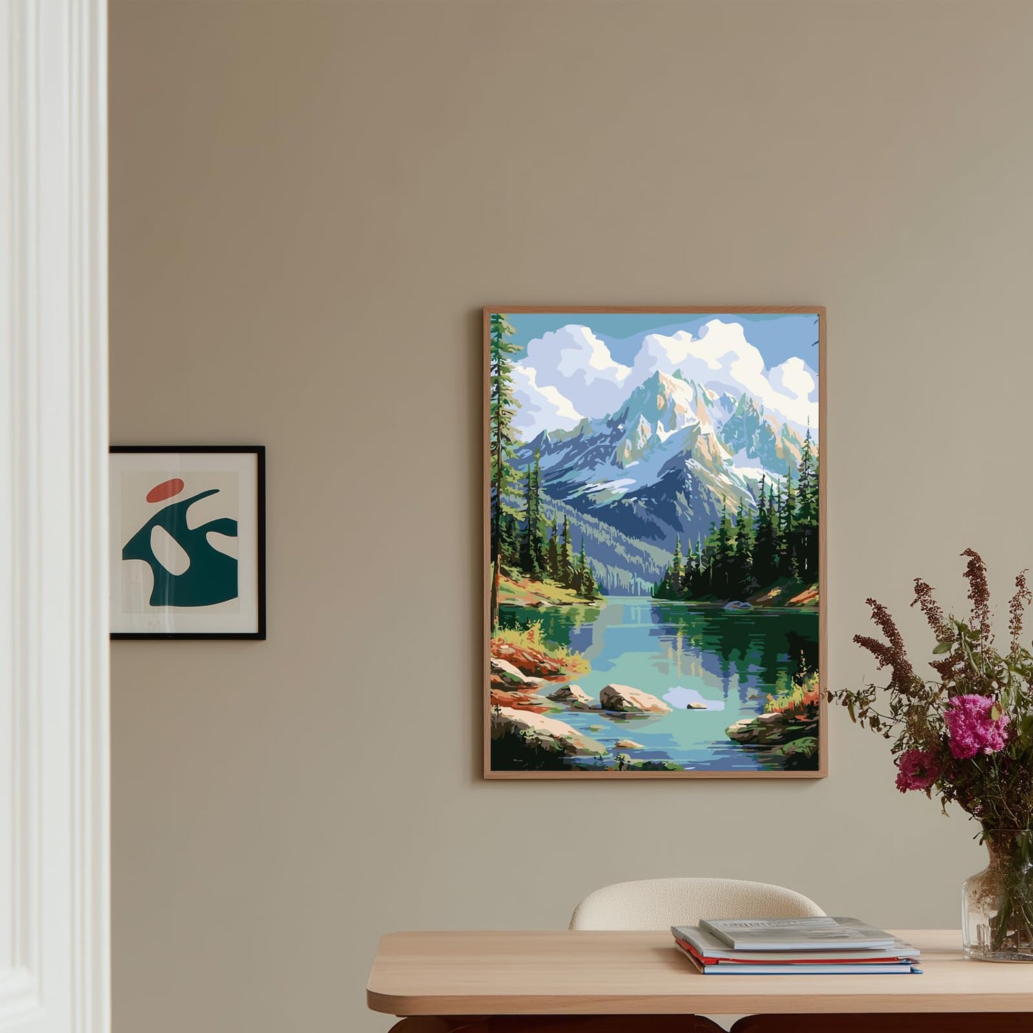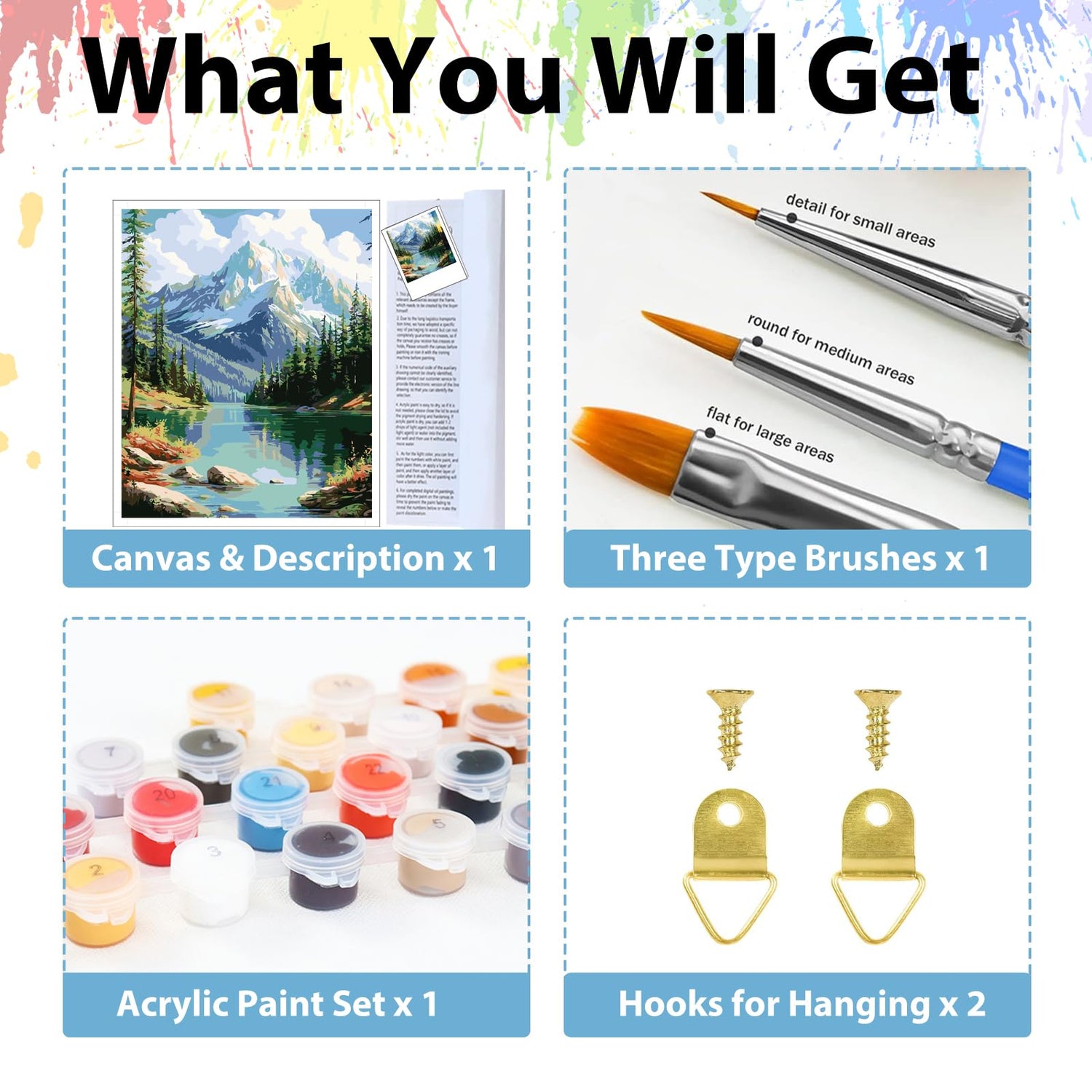 - [Stunning Natural Scenery, Immersive Experience]This paint by numbers vividly depicts a magnificent scene of snowy mountains and a tranquil lake. Towering snow - capped peaks, a serene lake, and dense pine forests set each other off, with the blue sky and white clouds reflected in the water, just like a fairyland. Hanging it at home is like bringing this fresh and natural beauty indoors, offering an immersive visual treat that soothes your body and mind.