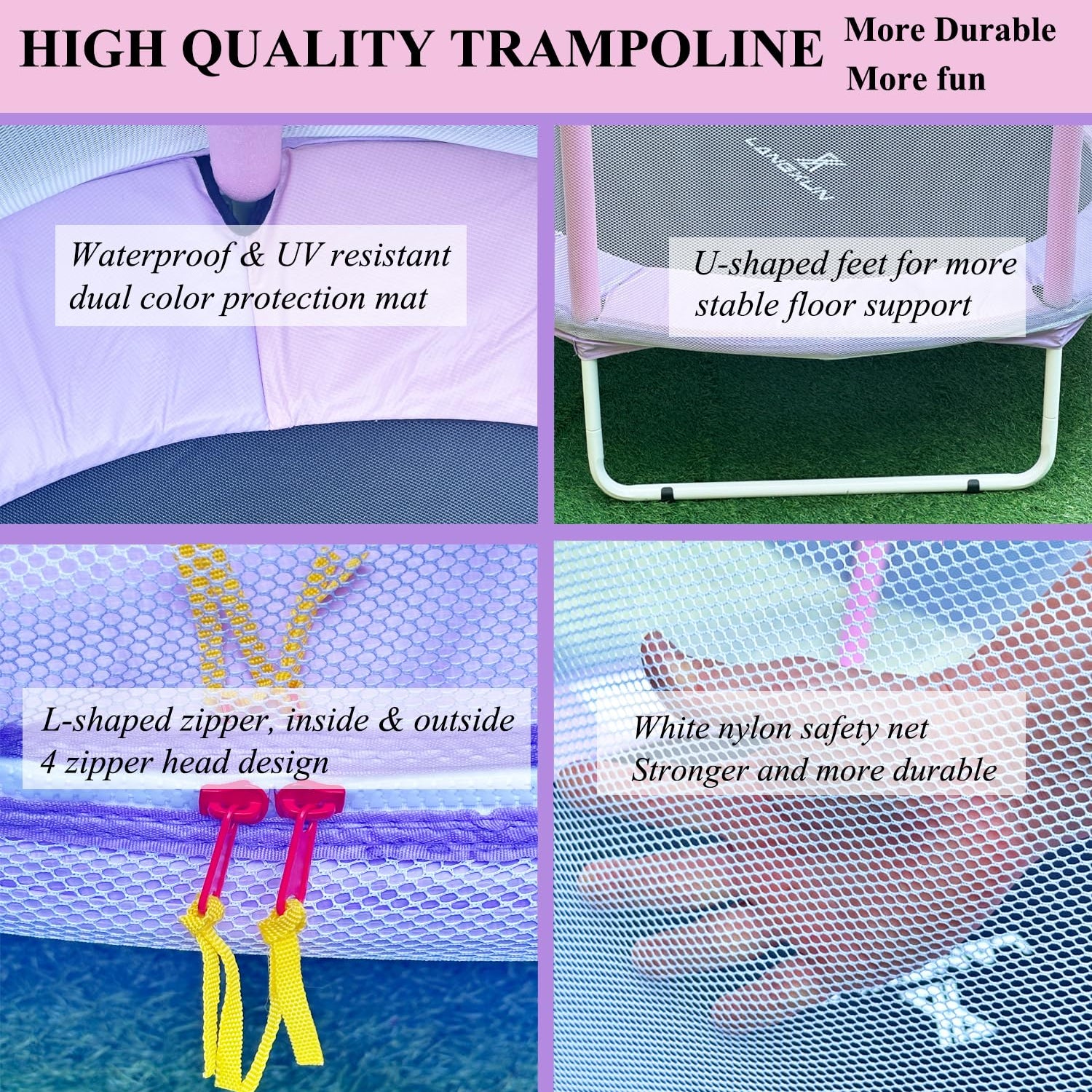 - [2024 MATERIAL UPGRADE] The trampoline is constructed with thickened steel pipes and a two-tier baby fence-style metal frame structure, making it more solid and durable. 30pcs 3.5-inch springs provide excellent bounce, with a waterproof and thickened wear-resistant PP protective pad. The U-shaped foot design, along with large anti-slip suction cups, ensures stable play without tipping over.