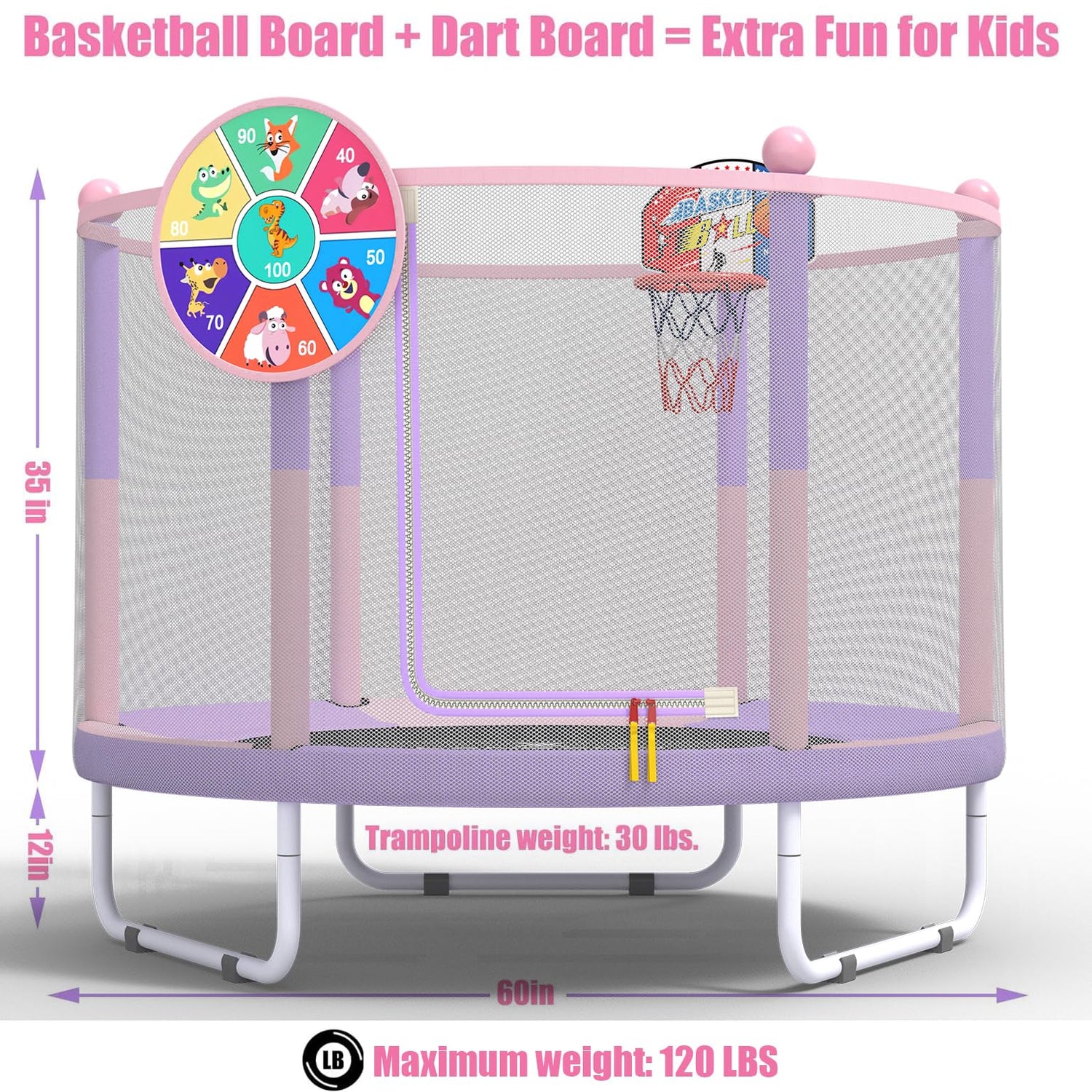 LANGXUN 60" Trampoline for Kids, 5ft Mini Toddler Indoor & Outdoor Trampoline with Net, Basketball Hoop & Dart Board, Birthday Gifts for Boys & Girls, Baby Toddler Christmas Toys (Pink & Purple)