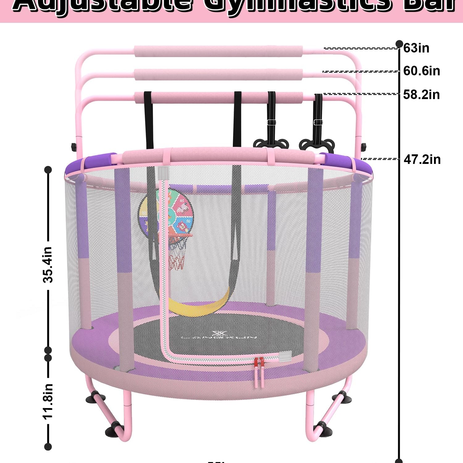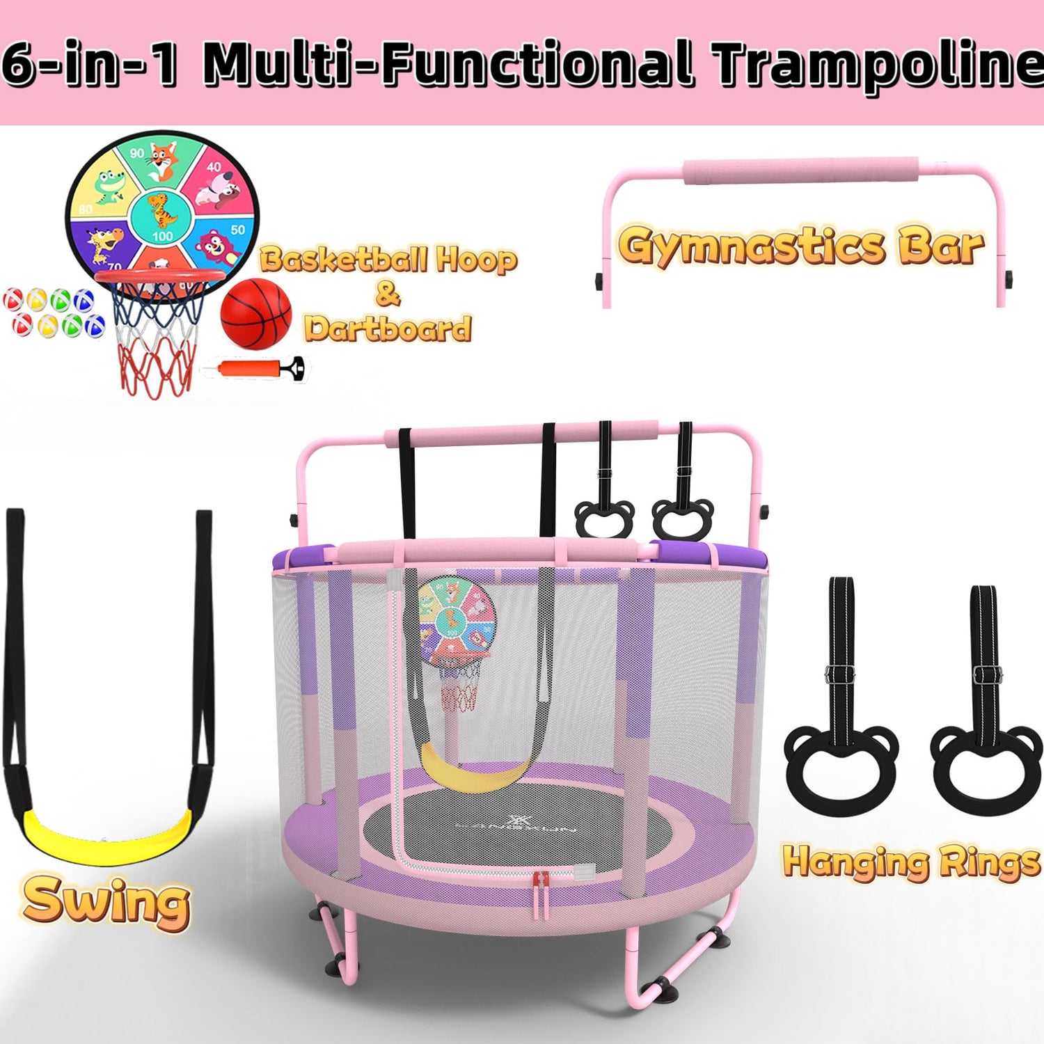 - [6-IN-1 MULTIFUNCTIONAL TRAMPOLINE] This trampoline not only provides jumping fun but also includes a basketball hoop, children's dartboard, swing, rings, and a gymnastics horizontal bar with three adjustable heights. It can also be used as a private safety house and tent for children. Let kids play to their hearts' content all day long. Suitable for indoor and outdoor use.