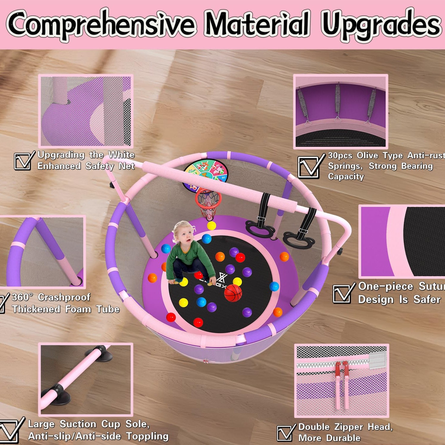 - [2024 MATERIAL UPGRADE] The trampoline is constructed with thickened steel pipes and a two-tier baby fence-style metal frame structure, making it more solid and durable. 30pcs 3.5-inch springs provide excellent bounce, with a waterproof and thickened wear-resistant PP protective pad. The U-shaped foot design, along with large anti-slip suction cups, ensures stable play without tipping over.