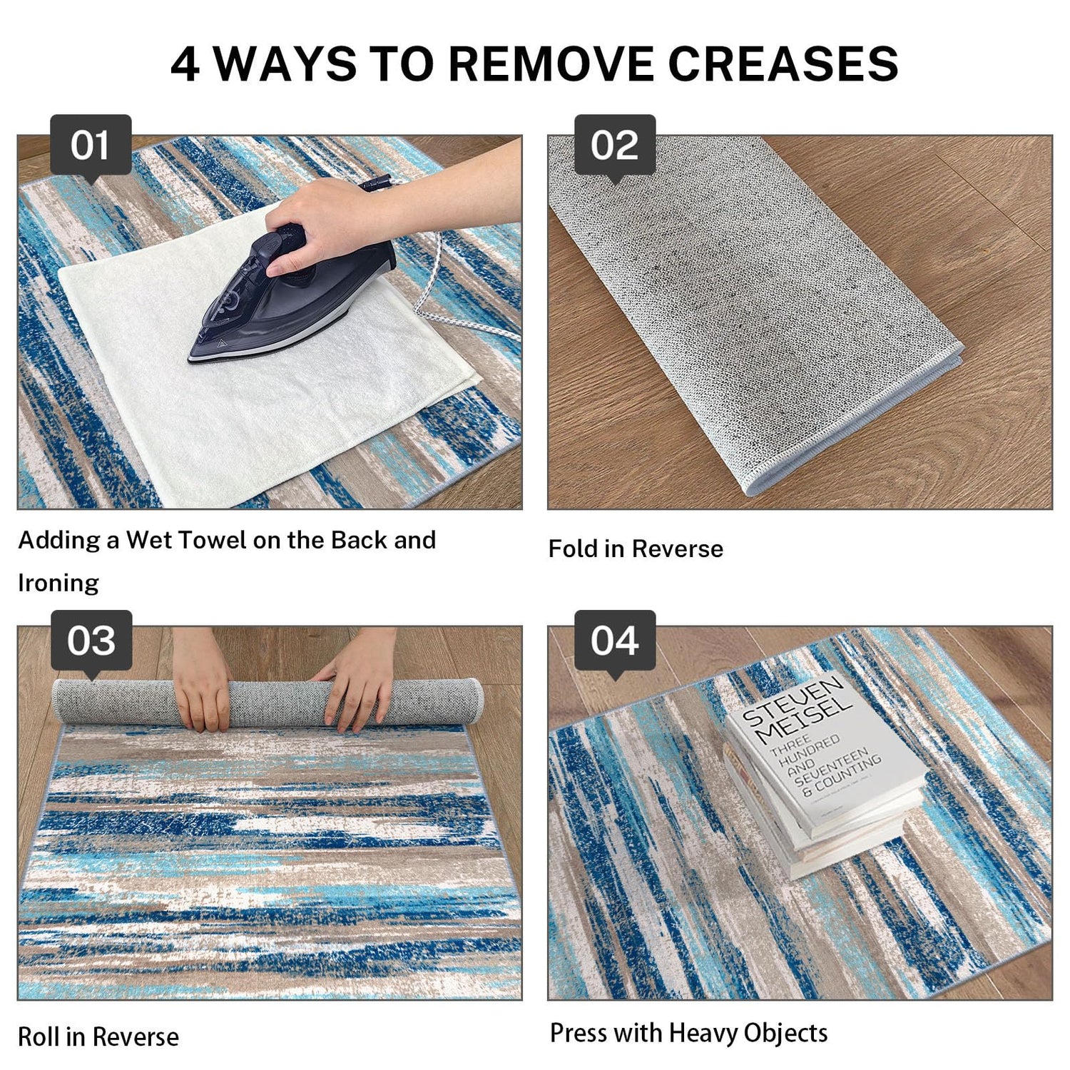 - Key Reminder: To smooth out creases, first add a wet towel on the back and iron on a low heat setting; Next, reverse fold and roll it for up to a week; Then, place weights evenly if needed; Finally, lay it flat in an open space; Note: Slight color variations may occur under different lighting, making it appear brighter than in photos