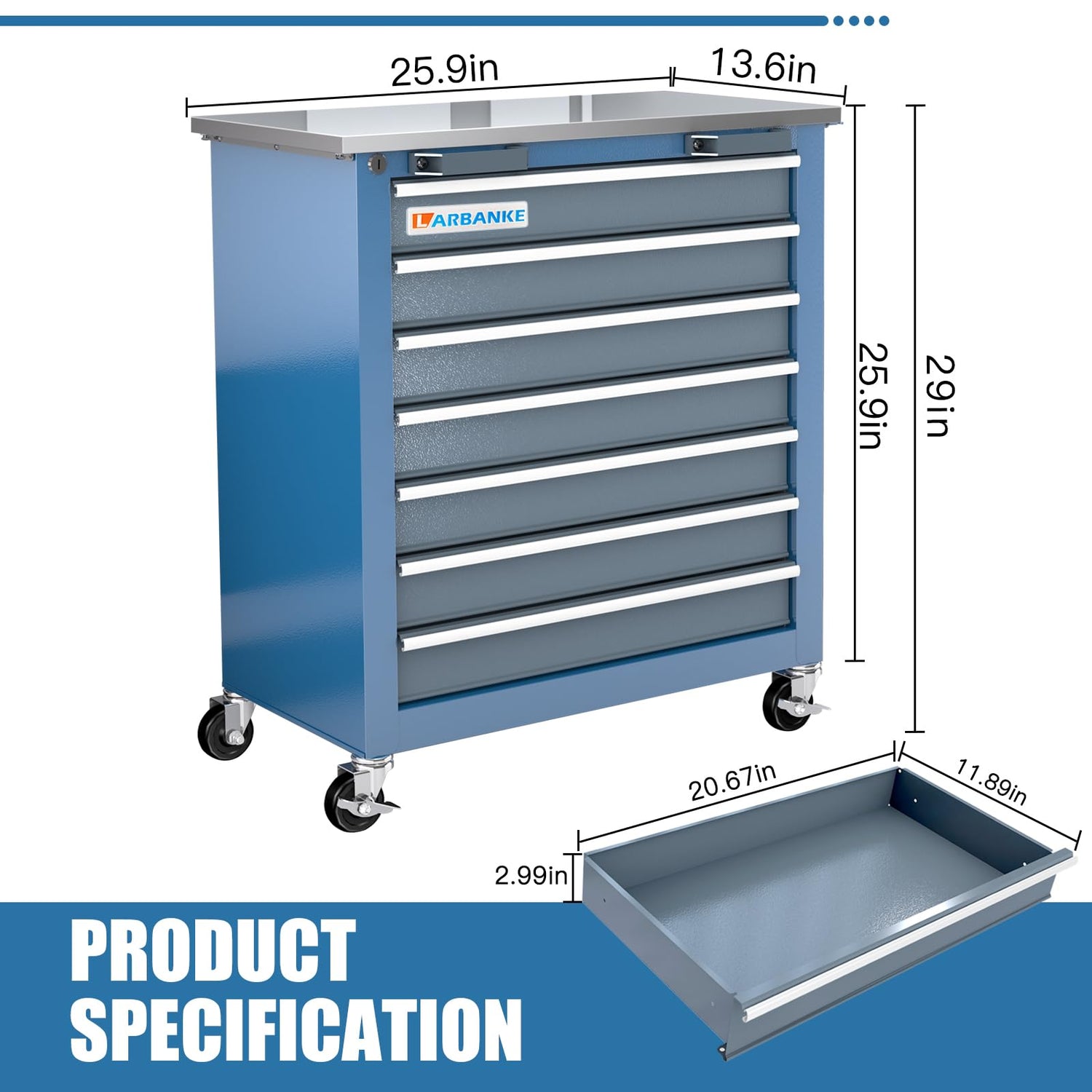 LARBANKE 7-Drawer Rolling Tool Chest with Stainless Steel Countertop,Tool Chest with Secure Locking System,Tool Cabinet with 360°Wheels and Padded Feet,for Home, Garage and Office