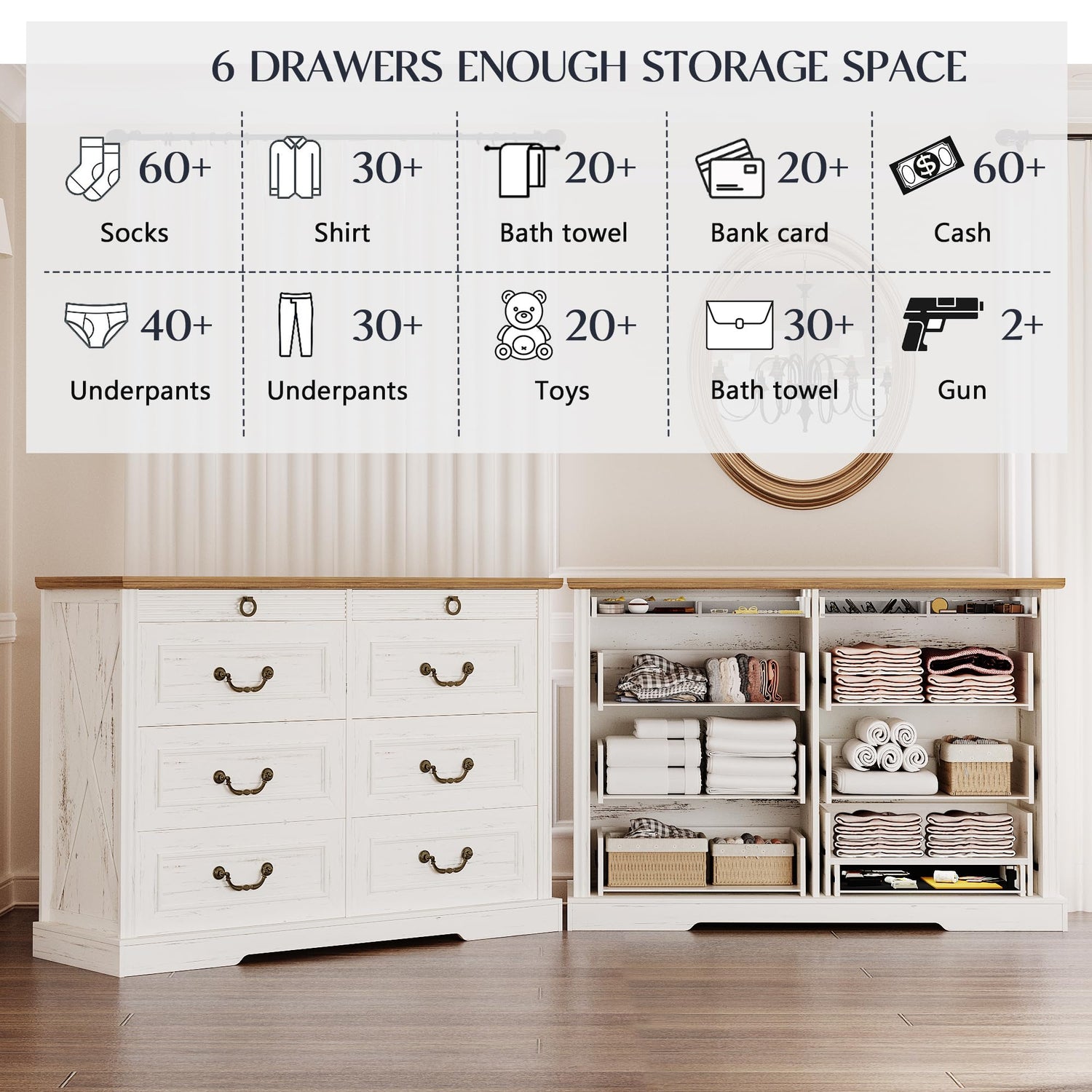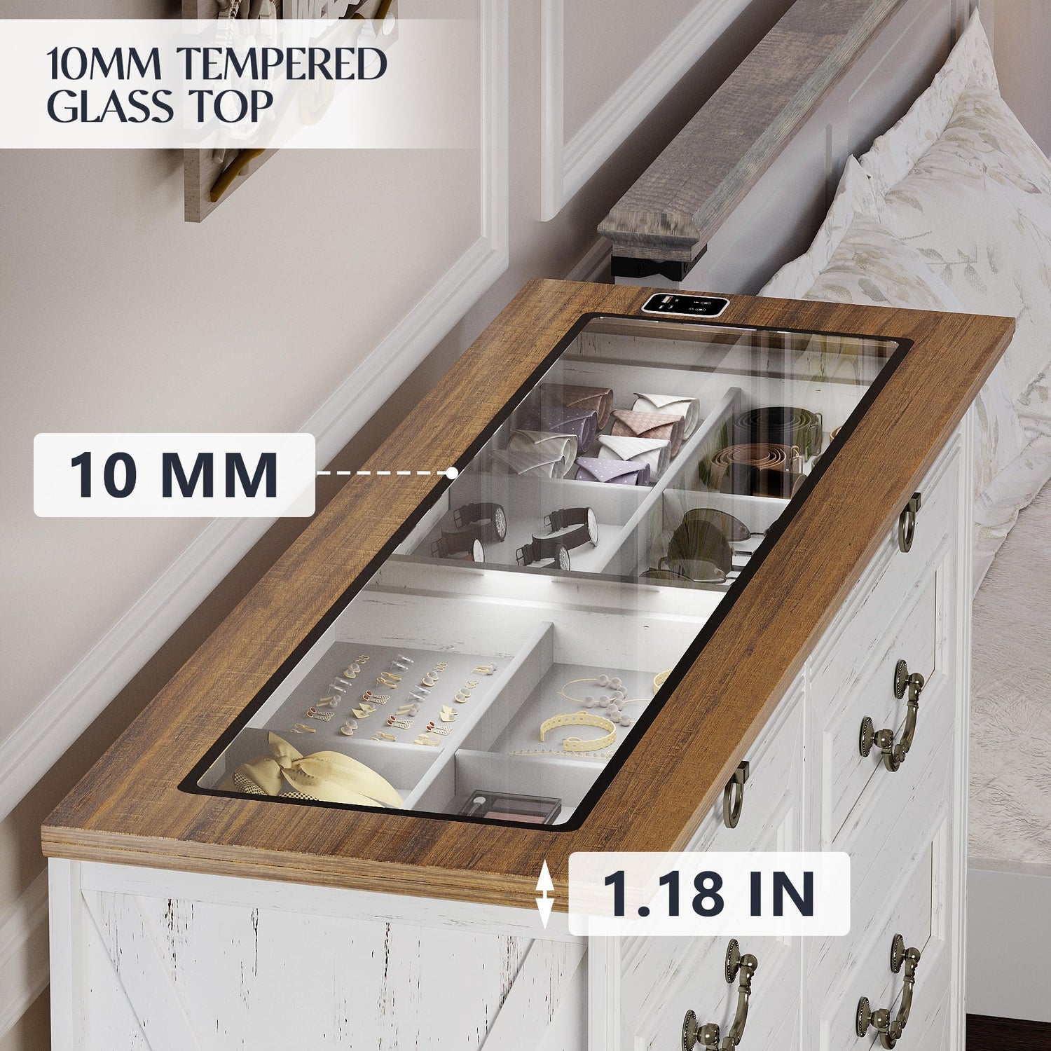 Lareth Farmhouse 6 Drawer Dresser for Bedroom 47 inch Wooden Double Chest of Drawers with Glass Top LED Lights Charging Station One Hidden Drawer Closet Dresser Tv Stand for Living Room, Antique White