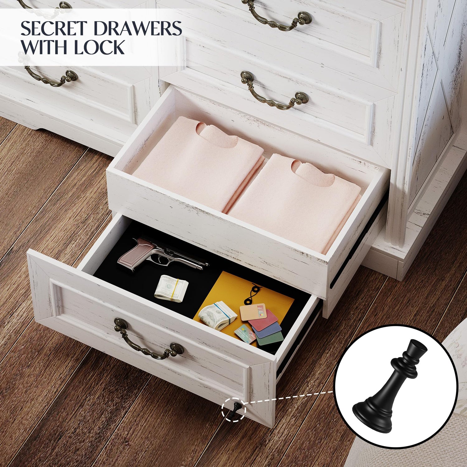 - Extra Hidden Secret drawers with lock and key: secret drawers were hidden behind on one large drawer, when pull out large one, could not find it, until using key to open it, a magic hidden drawer was there, you can see a secret drawer for holding cash and paper with lock and key.