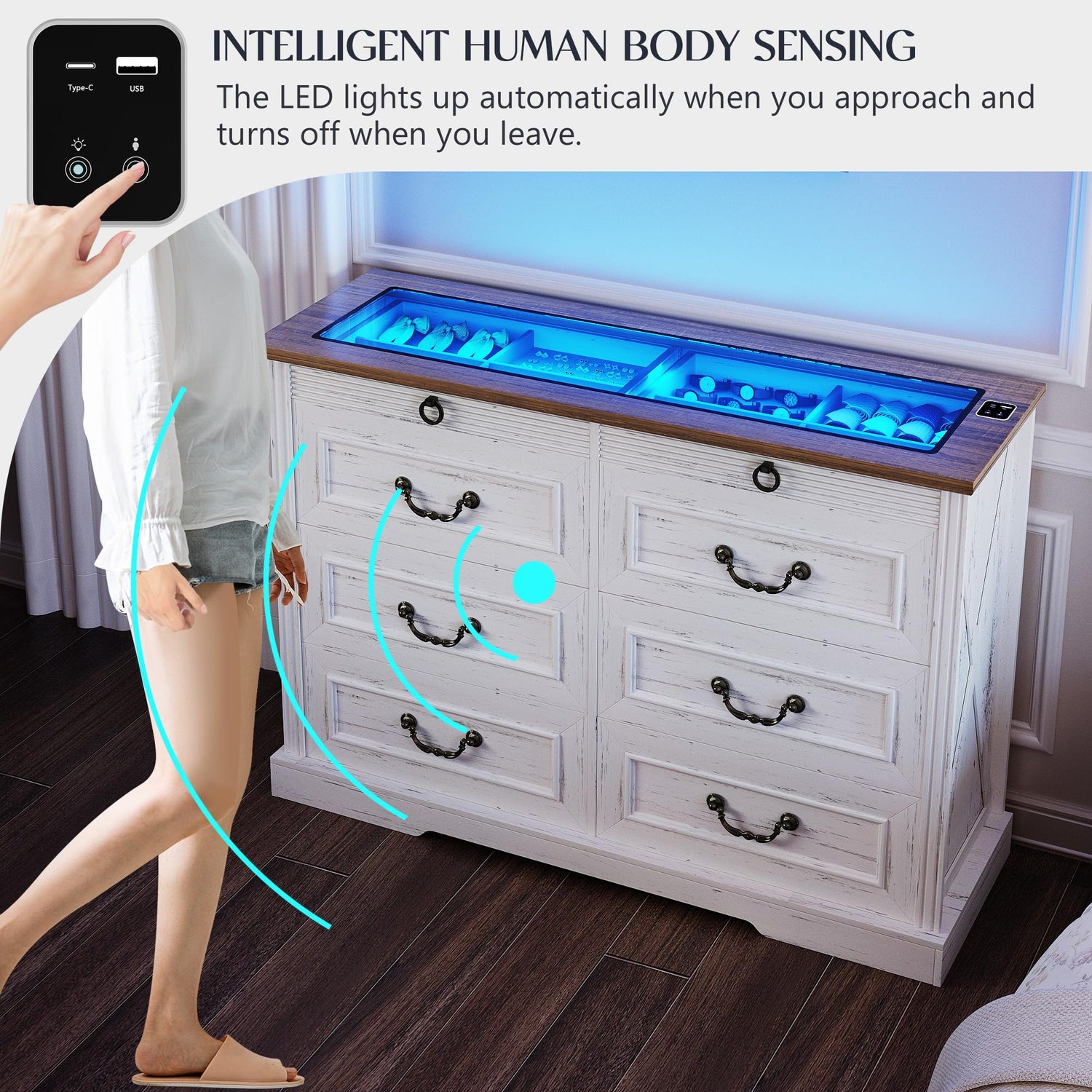 - Smart Closet Dresser for Bedroom with LED Lights, Charging Station and Human Body senor: one type-C and one USB point are ready for your phone or other electrical products. when turn on the button of senor, while people were close to it, it would control the LED light trough testing human temperature. when turn it off, it would be controlled 3 colors LED lights by hand.