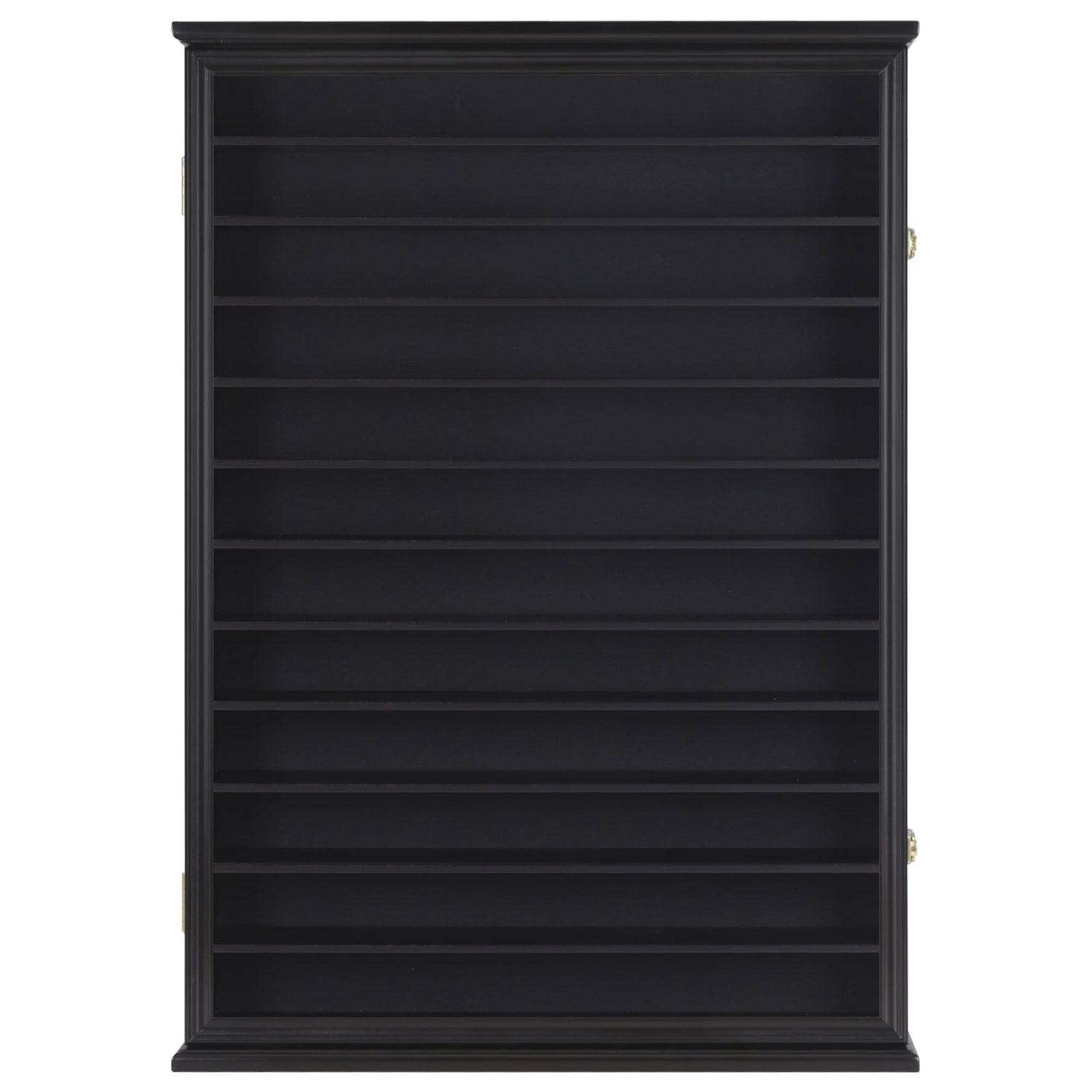 - Display Case Cabinet made from solid beechwood, stained BLACK. Dimensions: 36.5" H X 25.5" W X 4"D Space between rows: 2.5" with all shelves in. 5.25" with one shelf removed. Interior Depth 2.75"
