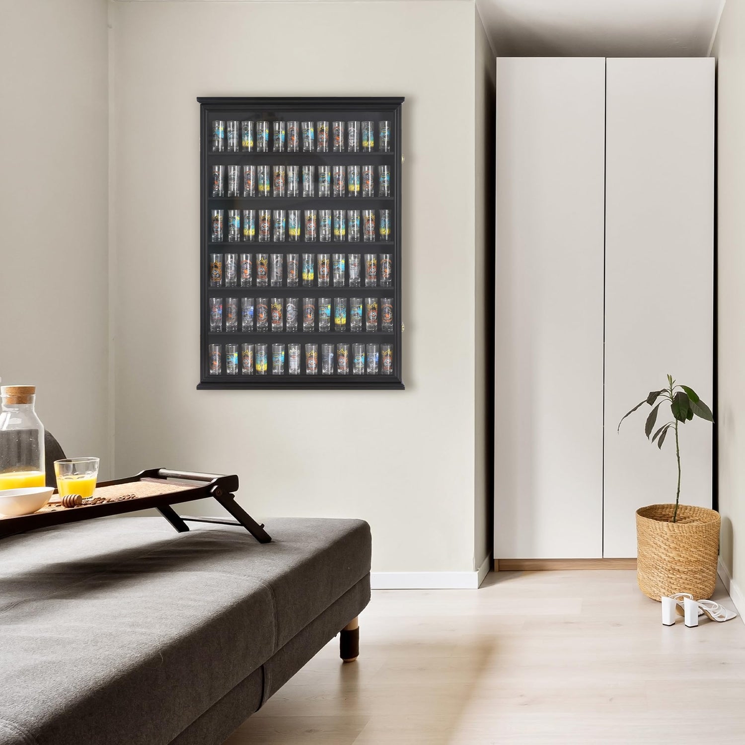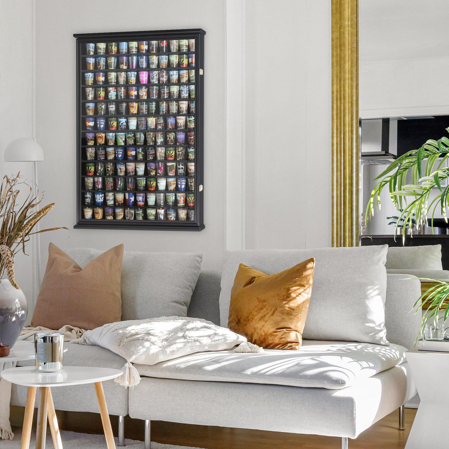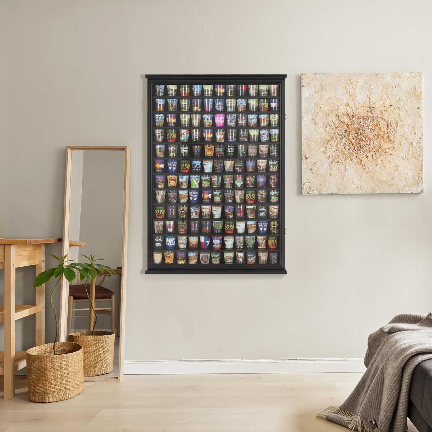 Large 144 Shot Glass Display Case Rack Solid Wood Cabinet Holder Wall Curio Cabinet Shadow Box for Action Figures Small Figurines - Lockable with UV