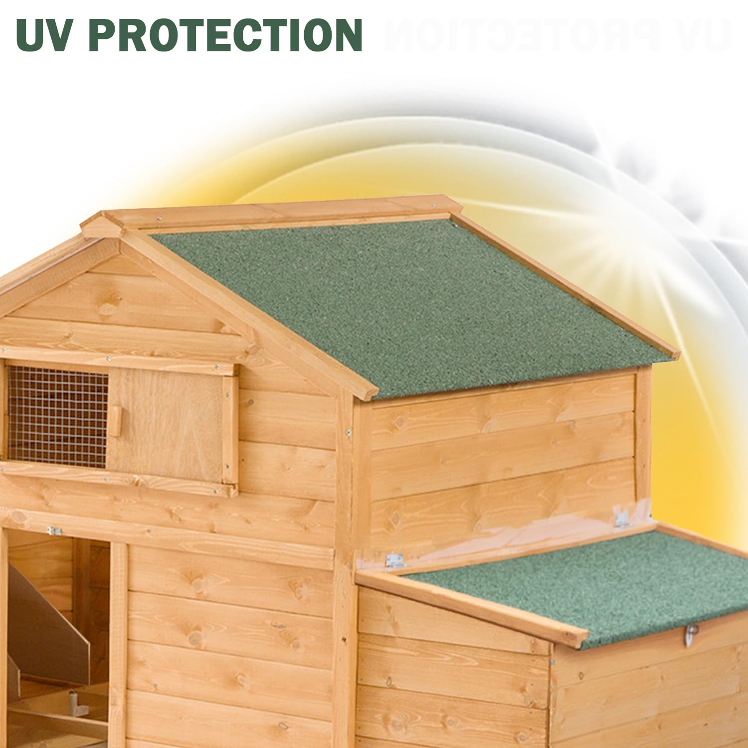 - 【Weatherproof Chicken Coop】 The top of the coop and the top of the nesting boxes are waterproof asphalt sheets, and there are PVC waterproof strips above the nesting boxes to avoid underwater seepage. The living area is at a certain distance from the ground to prevent moisture and can give your pet a clean and comfortable home.
