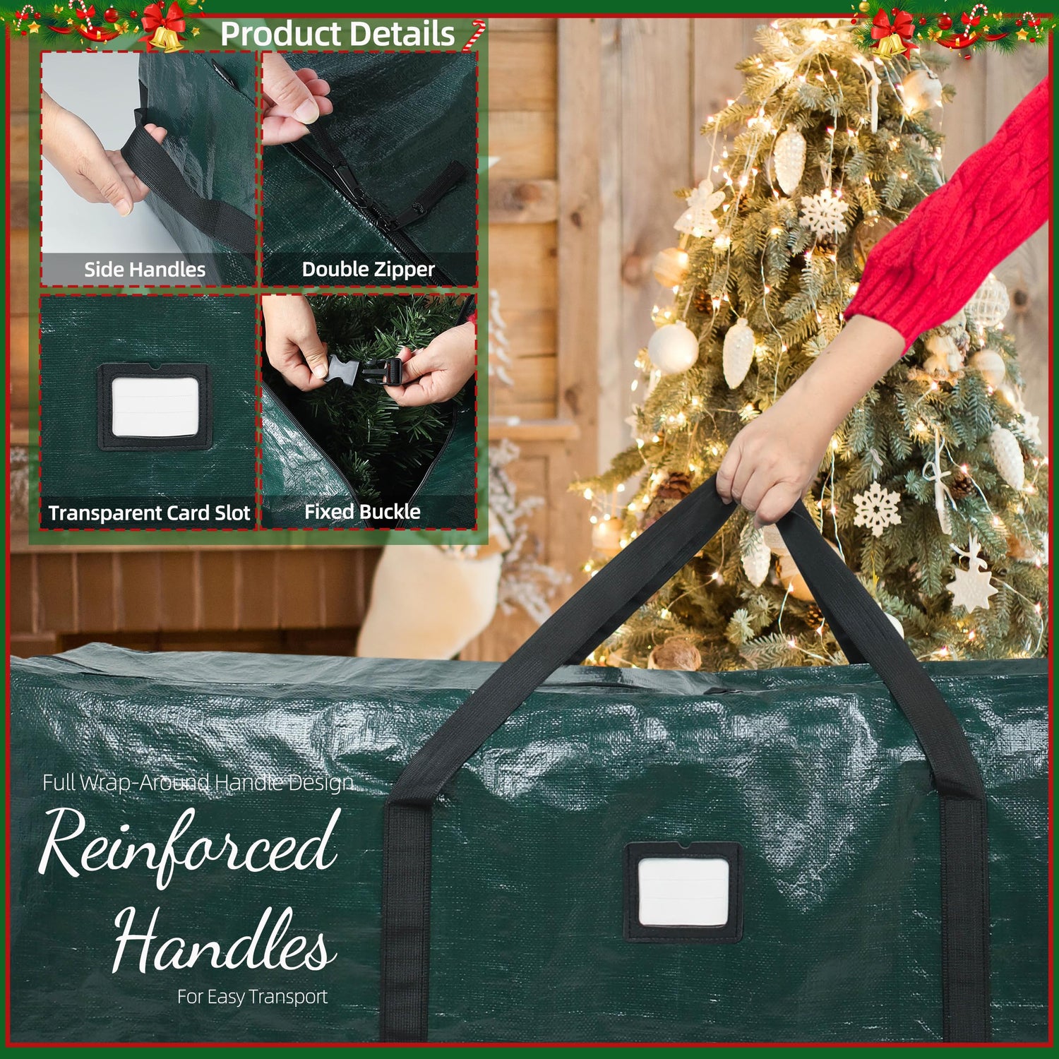 - Easy To Use:Transparent card slots can mark Christmas trees or other holiday decorations for quick identification,full wrap-around hand design reinforces the mobility of the bag,storage bag adds buckles and long webbing design inside to fix your Christmas tree to prevent deformation during movement and the large opening double zipper design facilitates storage and access to the Christmas tree.No need to repeatedly search for storage boxes or guess which box contains the Christmas tree or wreath