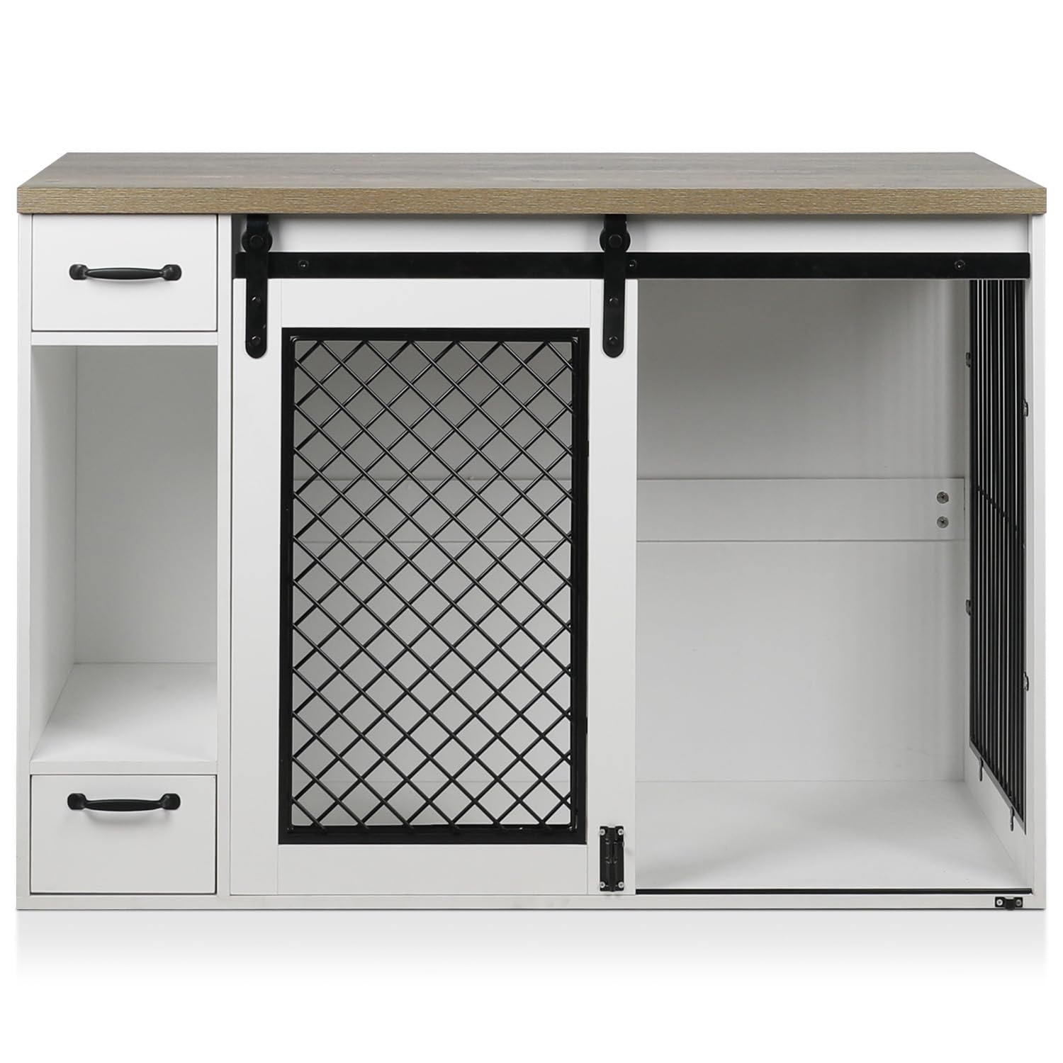 Large Dog Crate, Dog Crates for Medium Dogs, 47.2" Dog Kennel Indoor with Drawers, Feeder Bowls and Storage, 2 Sliding Doors, Heavy Duty Dog Crate Farmhouse Modern Side End Table for Small Medium Dogs