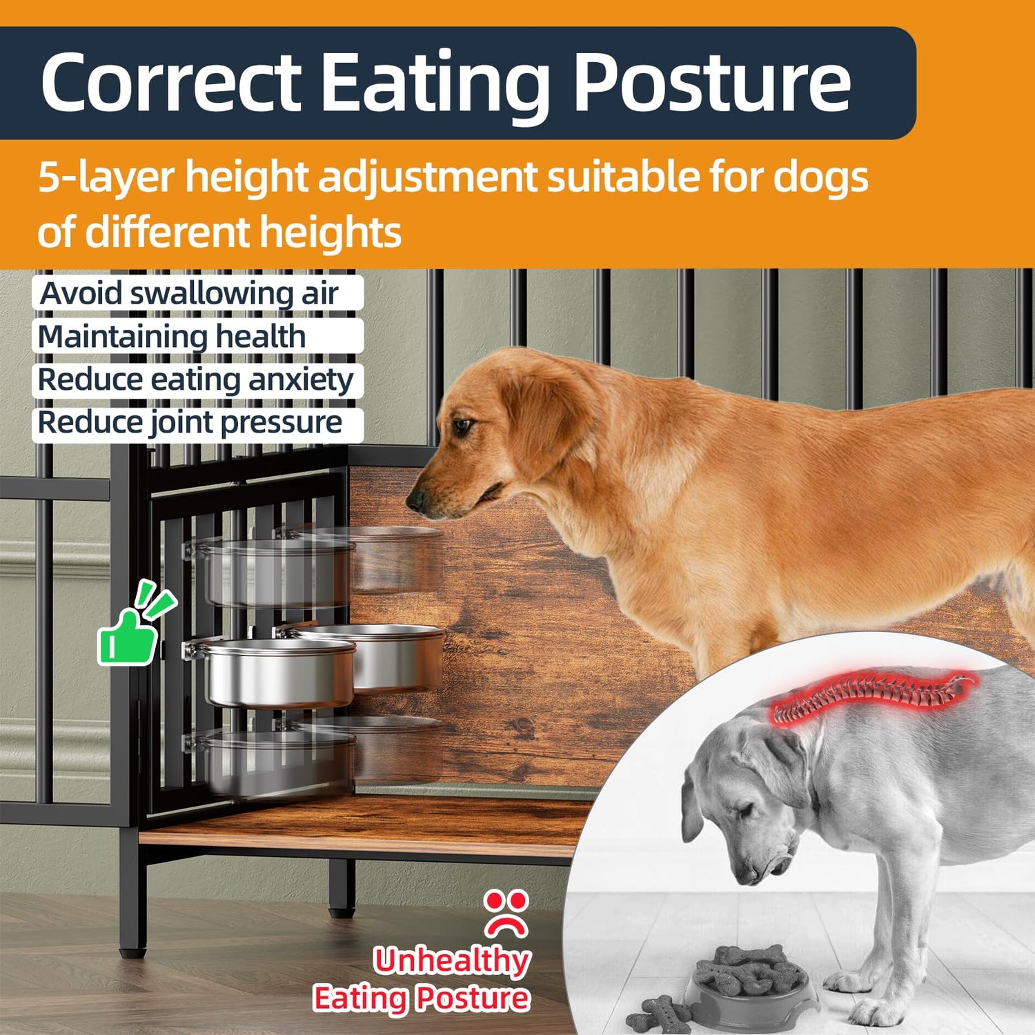Large Dog Crate Furniture, with 360° Adjustable Elevated Feeder, Heavy Dog Furniture, Indoor Decorative Dog Kennel, Sturdy Metal Construction, 38" W×21" D×36" H, Rustic Brown Finish