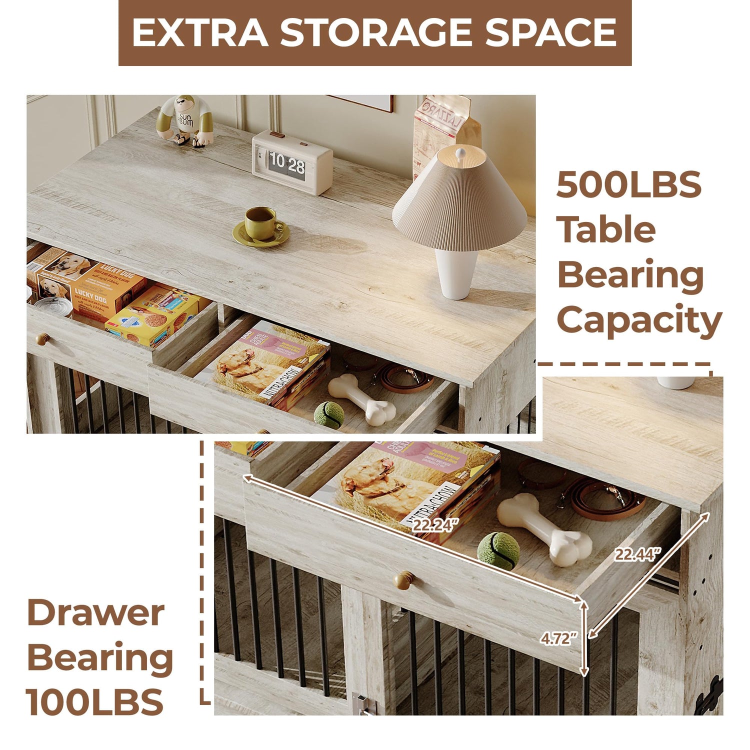 - Extra Storage Space:Two spacious storage drawers meet various needs, perfect for storing dog supplies. For medium-sized dogs, the fence can be adjusted to create extra storage space.