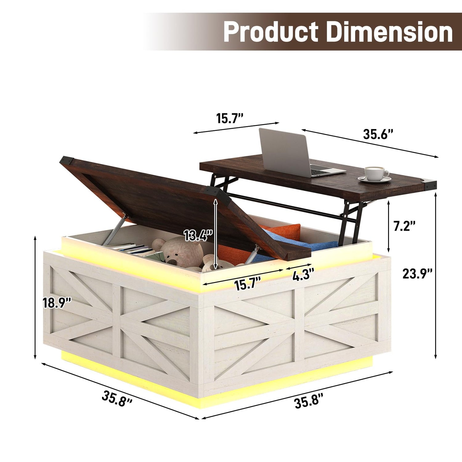 Large Farmhouse Lift Top Coffee Table with Hidden Storage Compartment, Wood Square Center Table with Charging Station&USB Ports for Living Room, White